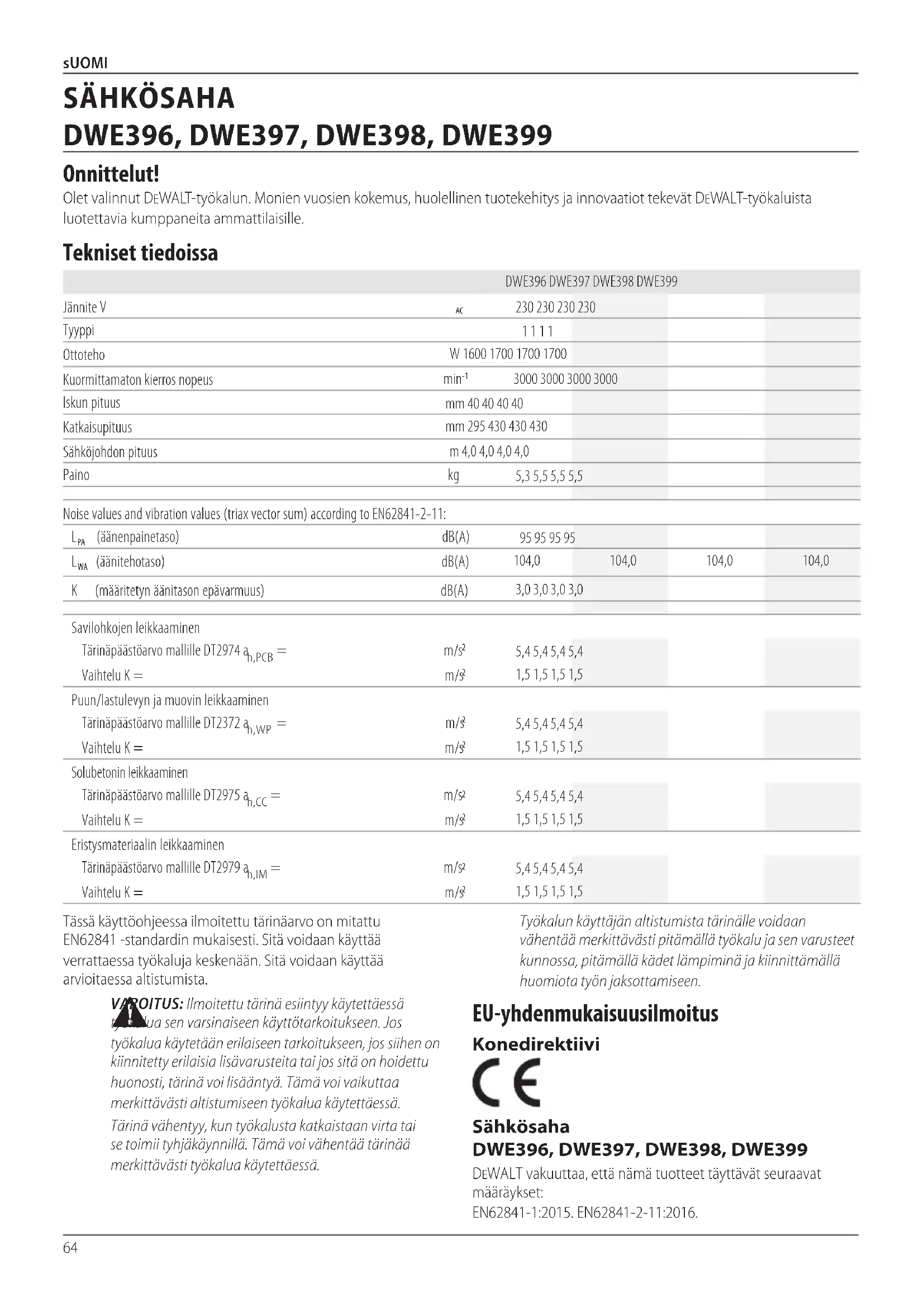 DeWALT vakuuttaa, että nämä tuotteet täyttävät seuraavat määräykset: EN62841-1:2015. EN62841-2-11:2016. Tässä käyttöohjeessa ilmoitettu tärinäarvo on mitattu EN62841 -standardin mukaisesti. Sitä voidaan käyttää verrattaessa työkaluja keskenään. Sitä voidaan käyttää arvioitaessaaltistumista.