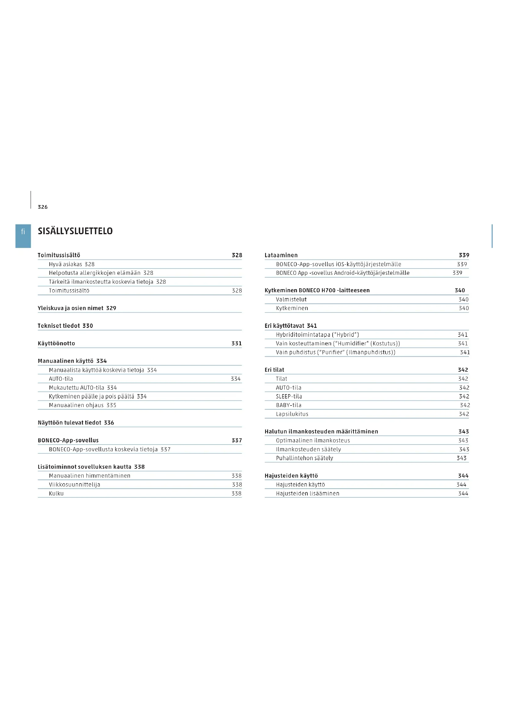 SISÄLLYSLUETTELO Toimitussisältö 328 Hyvä asiakas 328 Helpotusta allergikkojen elämään 328 Tärkeitä ilmankosteutta koskevia tietoja 328 Toimitussisältö 328 Yleiskuva ja osien nimet 329 Tekniset tiedot 330 Käyttöönotto 331 Manuaalinen käyttö 334 Manuaalista käyttöä koskevia tietoja 334 AUTO-tila 334 Mukautettu AUTO-tila 334 Kytkeminen päälle ja pois päältä 334 Manuaalinen ohjaus 335 Näyttöön tulevat tiedot 336 BONECO-App-sovellus 337 BONECO-App-sovellusta koskevia tietoja 337 Lisätoiminnot sovelluksen kautta 338 Manuaalinen himmentäminen 338 Viikkosuunnittelija 338 Kulku 338 Lataaminen 339 BONECO-App-sovellus iOS-käyttöjärjestelmälle 339 BONECO App -sovellus Android-käyttöjärjestelmälle 339 Kytkeminen BONECO H700 -laitteeseen 340 Valmistelut 340 Kytkeminen 340 Eri käyttötavat 341 Hybriditoimintatapa (”Hybrid”) 341 Vain kosteuttaminen (”Humidifier” (Kostutus)) 341 Vain puhdistus (”Purifier” (Ilmanpuhdistus)) 341 Eri tilat 342 Tilat 342 AUTO-tila 342 SLEEP-tila 342 BABY-tila 342 Lapsilukitus 342 Halutun ilmankosteuden määrittäminen 343 Optimaalinen ilmankosteus 343 Ilmankosteuden säätely 343 Puhallintehon säätely 343 Hajusteiden käyttö 344 Hajusteiden käyttö 344 Hajusteiden lisääminen 344327