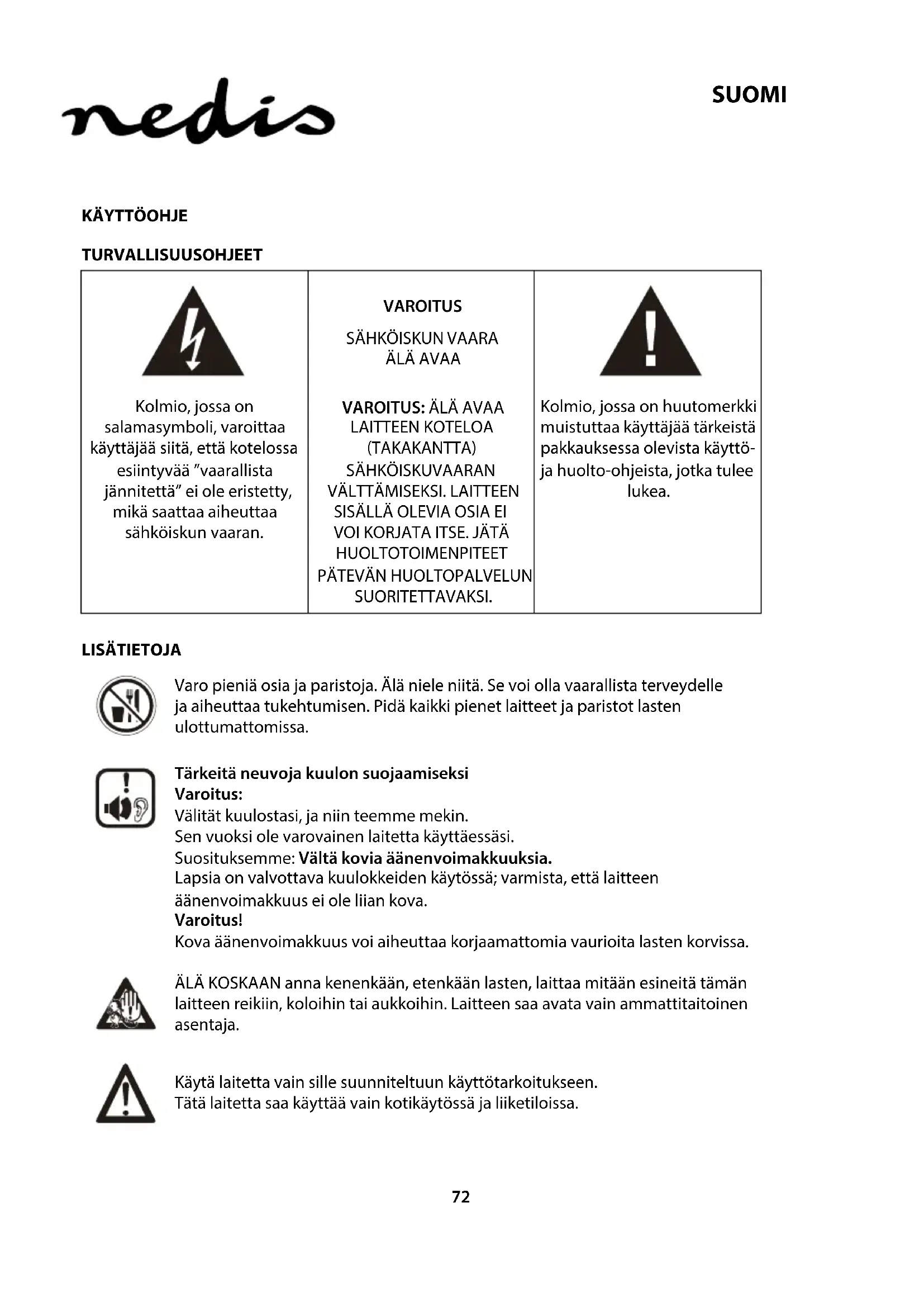 ÄLÄ AVAA Turvallisuustoimenpiteet: Sähköiskun riskin pienentämiseksi, AINOASTAAN valtuutettu huoltohenkilö saa avata tämän laitteen huoltoa varten. Jos ongelmia ilmenee, irrota laite verkkovirrasta ja muista laitteista. Älä altista laitetta vedelle ja kosteudelle. Huolto: Puhdista ainoastaan kuivalla liinalla. Älä käytä liuottimia tai hankausaineita. Takuu: Takuu ja vastuuvelvollisuus mitätöityvät, jos tuote vaurioituu siihen tehtyjen muutoksien tai sen väärinkäytön takia. Yleistä: Muutoksia malliin ja teknisiin ominaisuuksiin voidaan tehdä ilmoituksetta. Kaikki logot, merkit ja tuotenimet ovat niiden vastaavien omistajien tuotemerkkejä tai rekisteröityjä tuotemerkkejä ja niitä on käsiteltävä sellaisina. Säilytä käyttöohjeet ja pakkaus myöhempää käyttötarvetta varten. Huomio: Tämä tuote on merkitty tällä symbolilla. Se merkitsee, ettei käytettyjä sähkö- tai elektronisia tuotteita saa hävittää kotitalousjätteen mukana. Kyseisille tuotteille on olemassa erillinen keräysjärjestelmä. Tämä tuote on valmistettu ja toimitettu noudattaen kaikkia sitä koskevia asetuksia ja direktiivejä, jotka ovat voimassa kaikissa Euroopan unionin jäsenvaltioissa. Se täyttää myös kaikki myyntimaassa sovellettavat vaatimukset ja määräykset. Viralliset asiakirjat ovat saatavilla pyynnöstä. Asiakirjoihin sisältyvät seuraavat, mutta näihin rajoittumatta: Vaatimustenmukaisuusvakuutus (ja tuotteen tunniste), käyttöturvallisuustiedote, tuotteen testiraportti. Saat neuvoja ottamalla yhteyttä asiakaspalveluumme: verkkosivun kautta: http://www.nedis./-/ota-yhteytta/yhteyslomake.htm sähköpostilla: service@nedis.com puhelimitse: +31 (0)73-5993965 (toimistoaikoina) NEDIS B.V., De Tweeling 28, 5215 MC ’s-Hertogenbosch, ALANKOMAAT80 SVENSKA INSTRUKTIONSBOK SÄKERHETSANVISNINGAR VARNING