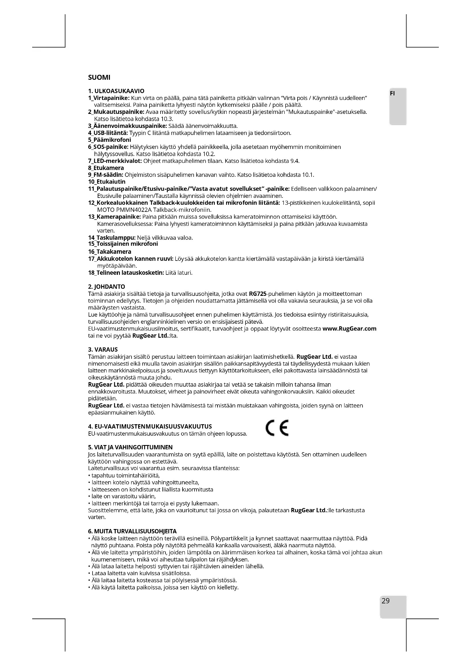 Tämä asiakirja sisältää tietoja ja turvallisuusohjeita, jotka ovat RG725-puhelimen käytön ja moitteettoman toiminnan edellytys. Tietojen ja ohjeiden noudattamatta jättämisellä voi olla vakavia seurauksia, ja se voi olla määräysten vastaista. Lue käyttöohje ja nämä turvallisuusohjeet ennen puhelimen käyttämistä. Jos tiedoissa esiintyy ristiriitaisuuksia, turvallisuusohjeiden englanninkielinen versio on ensisijaisesti pätevä. EU-vaatimustenmukaisuusilmoitus, sertifikaatit, turvaohjeet ja oppaat löytyvät osoitteesta www.RugGear.com tai ne voi pyytää RugGear Ltd.:lta.