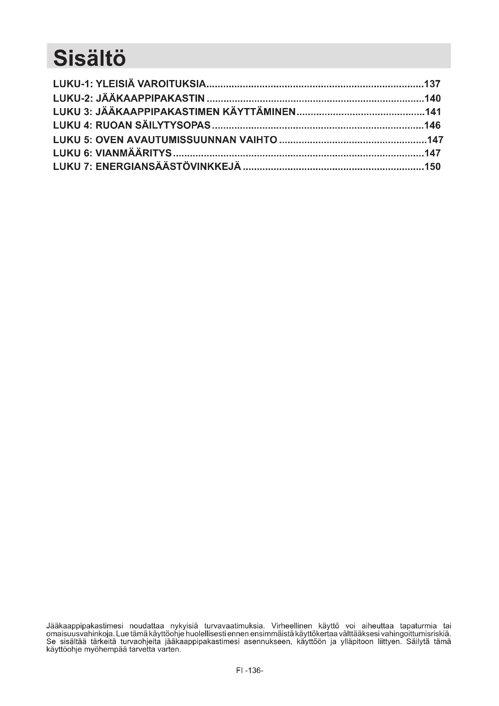 Jääkaappipakastimesi noudattaa nykyisiä turvavaatimuksia. Virheellinen käyttö voi aiheuttaa tapaturmia tai omaisuusvahinkoja. Lue tämä käyttöohje huolellisesti ennen ensimmäistä käyttökertaa välttääksesi vahingoittumisriskiä. Se sisältää tärkeitä turvaohjeita jääkaappipakastimesi asennukseen, käyttöön ja ylläpitoon liittyen. Säilytä tämä käyttöohje myöhempää tarvetta varten. Sisältö