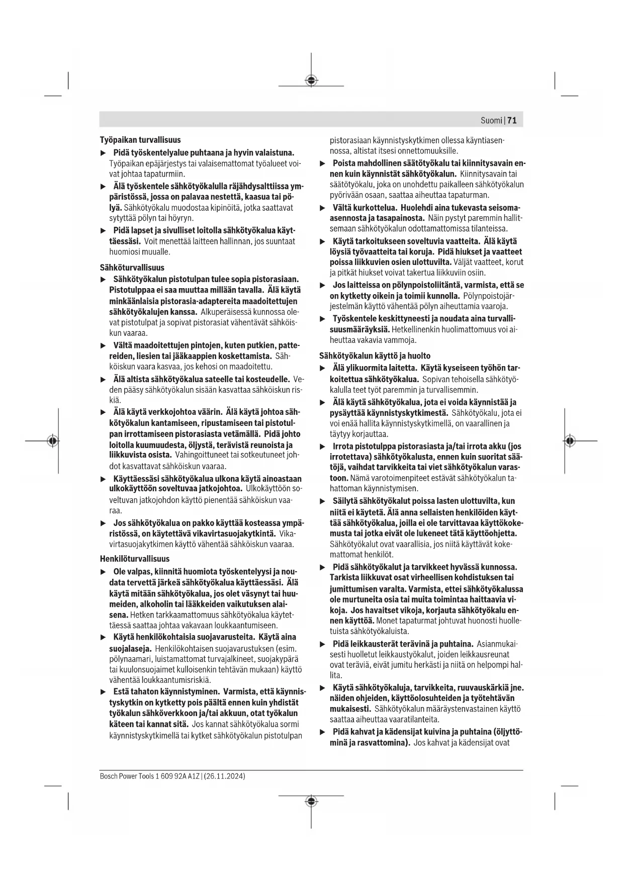 Näissä käyttöohjeissa ilmoitetut tärinä- ja melupäästötiedot on mitattu standardissa määritetyn mittausmenetelmän mu- kaan ja niitä voi käyttää sähkötyökalujen keskinäiseen vertai- luun. Ne soveltuvat myös tärinä- ja melupäästöjen alustavaan arviointiin. Ilmoitetut tärinä- ja melupäästöt vastaavat sähkötyökalun pääasiallisia käyttötapoja. Tärinä- ja melupäästöt saattavat kuitenkin poiketa ilmoitetuista arvoista, jos sähkötyökalua käytetään toisiin töihin, muilla käyttötarvikkeilla tai riittämät- tömästi huollettuna. Tämä saattaa suurentaa koko työsken- telyajan tärinä- ja melupäästöjä huomattavasti. Tärinä- ja melupäästöjen tarkaksi arvioimiseksi on huomioi- tava myös ne ajat, jolloin laite on sammutettuna tai tyhjä- käynnillä. Tämä voi vähentää huomattavasti koko työskente- lyajan tärinä- ja melupäästöjä. Määrittele tarvittavat lisävarotoimenpiteet käyttäjän suojele- miseksi tärinän aiheuttamilta haitoilta (esimerkiksi sähkötyö- kalujen ja käyttötarvikkeiden huolto, käsien pitäminen lämpi- minä ja työprosessien organisointi). Akku Bosch myy akkukäyttöisiä sähkötyökaluja myös ilman akkua. Pakkauksesta näet, sisältyykö akku sähkötyökalusi toimituk- seen. Bosch Power Tools 1 609 92A A1Z | (26.11.2024)74 | Suomi Akun lataminen u Käytä vain teknisissä tiedoissa ilmoitettuja latauslait- teita. Vain nämä latauslaitteet soveltuvat sähkötyökalus- sasi käytettävälle litiumioniakulle. Huomautus: kansainvälisten kuljetusmääräysten mukaisesti Li-ion-akut toimitetaan osittain ladattuina. Akun täyden suo- rituskyvyn varmistamiseksi akku tulee ladata täyteen ennen ensikäyttöä. Akun asentaminen Työnnä ladattu akku akun kiinnityskohtaan niin, että se lukit- tuu paikalleen. Akun irrottaminen Kun haluat ottaa akun pois, paina akun vapautuspainiketta ja vedä akku irti. Älä irrota akkua väkisin. Akussaon 2 lukitusvaihetta, millä estetään akun irtoaminen, jos painat tahattomasti akunvapautuspainiketta. Sähkötyö- kalussa oleva akku pysyy paikallaan jousen avulla. Akun lataustilan näyttö Huomautus: lataustilan näyttöä ei ole kaikissa akkutyypeissä. Akun lataustilan näytön vihreät LED-valot ilmoittavat akun la- taustilan. Turvallisuussyistä lataustilan tarkistaminen on mahdollista vain sähkötyökalun ollessa pysähdyksissä. Kun haluat nähdä lataustilan, paina lataustilan näytön paini- ketta tai . Tämä on mahdollista myös akun ollessa irro- tettuna. Jos lataustilan näytön painikkeen painaminen ei sytytä yh- tään LED-valoa, akku on viallinen ja täytyy vaihtaa. Akkutyyppi GBA 18V... LED-valo Kapasiteetti 3vihreää LED-valoa palaa jatkuvasti 60–100% 2vihreää LED-valoa palaa jatkuvasti 30–60% 1vihreä LED-valo palaa jatkuvasti 5–30% 1vihreä LED-valo vilkkuu 0–5% Akkutyyppi ProCORE18V... LED-valo Kapasiteetti 5vihreää LED-valoa palaa jatkuvasti 80–100% 4vihreää LED-valoa palaa jatkuvasti 60–80% 3vihreää LED-valoa palaa jatkuvasti 40–60% 2vihreää LED-valoa palaa jatkuvasti 20–40% 1vihreä LED-valo palaa jatkuvasti 5–20% 1vihreä LED-valo vilkkuu 0–5% Ohjeita akun optimaaliseen käsittelyyn Suojaa akku kosteudelta ja vedeltä. Säilytä akkua vain –20...50°C lämpötilassa. Älä jätä akkua esimerkiksi kuumana kesäpäivänä pitkäksi ajaksi autoon. Puhdista akun tuuletusaukot säännöllisin väliajoin peh- meällä, puhtaalla ja kuivalla siveltimellä. Huomattavasti lyhentynyt käyntiaika latauksen jälkeen osoit- taa, että akku on elinikänsä lopussa ja täytyy vaihtaa uuteen. Huomioi hävitysohjeet. Asennus u Ota akku pois sähkötyökalusta, ennen kuin teet säh- kötyökaluun liittyviä töitä (esim. huolto, käyttötarvik- keen vaihto jne.). Käynnistyskytkimen tahaton painallus aiheuttaa loukkaantumisvaaran. Sahanterän asennus/vaihto u Käytä työkäsineitä, kun asennat tai vaihdat sahante- rän. Käyttötarvikkeet ovat teräviä ja ne voivat kuumentua pitkäaikaisessa käytössä. u Tarkista sahanterää vaihtaessasi, ettei sahanterän kiinnityskohdassa ole epäpuhtauksia, esimerkiksi puu- tai metallipuruja. Sahanterän valinta Käytä vain 1/2":n U-varrella varustettuja sahanteriä. Sahan- terä ei saa olla liian pitkä. Terän pituuden tulee sopia kysei- seen sahaustyöhön. Sahanterän asennus (katsokuvaA) Paina sahanterää(1) voimakkaasti sahanterän kiinnittimen(4) sisään, kunnes se napsahtaa kuuluvasti kiinni. Lukitusholkki(3) kääntyy tällöin noin 90 astetta ja lu- kitsee sahanterän. Jos sahanterä(1) ei lukitu, käännä lukitusholkkia(3) noin 90 astetta nuolen suuntaan, kunnes se lukittuu avattuun asentoon ja kuulet naksahduksen. Paina tämän jälkeen sa- hanterää uudelleen sahanterän kiinnittimen(4) sisään. u Tarkista kunnollinen kiinnitys sahanterästä vetämällä. Löysä sahanterä voi irrota ja johtaa tapaturmaan. Tiettyjä töitä varten voit asentaa sahanterän(1) 180° verran (hampaat osoittavat ylöspäin) käännetyssä asennossa. Sahanterän irrotus (katsokuvaB) u Kun irrotat sahanterän, pidä sähkötyökalua sellai- sessa asennossa, jossa irtoava sahanterä ei voi vahin- goittaa ihmisiä tai eläimiä. Käännä lukitusholkkia(3) noin 90 astetta nuolen suuntaan. Sahanterä(1) irtoaa. Pölyn-/purunpoisto Työstettävistä materiaaleista syntyvä pöly (esimerkiksi lyijy- pitoinen pinnoite, tietyt puulaadut, kivi ja metalli) voi olla ter- veydelle vaarallista. Pölyn koskettaminen tai hengittäminen saattaa aiheuttaa käyttäjälle tai lähellä oleville ihmisille aller- gisia reaktioita ja/tai hengitystiesairauksia. 1 609 92A A1Z | (26.11.2024) Bosch Power ToolsSuomi | 75 Tietyt pölylaadut (esimerkiksi tammi- tai pyökkipöly) katso- taan syöpää aiheuttaviksi, varsinkin puunkäsittelyaineiden yhteydessä (kromaatti, puunsuoja-aine). Asbestipitoisia ai- neita saavat käsitellä vain ammattilaiset. – Huolehdi työkohteen hyvästä tuuletuksesta. – Suosi