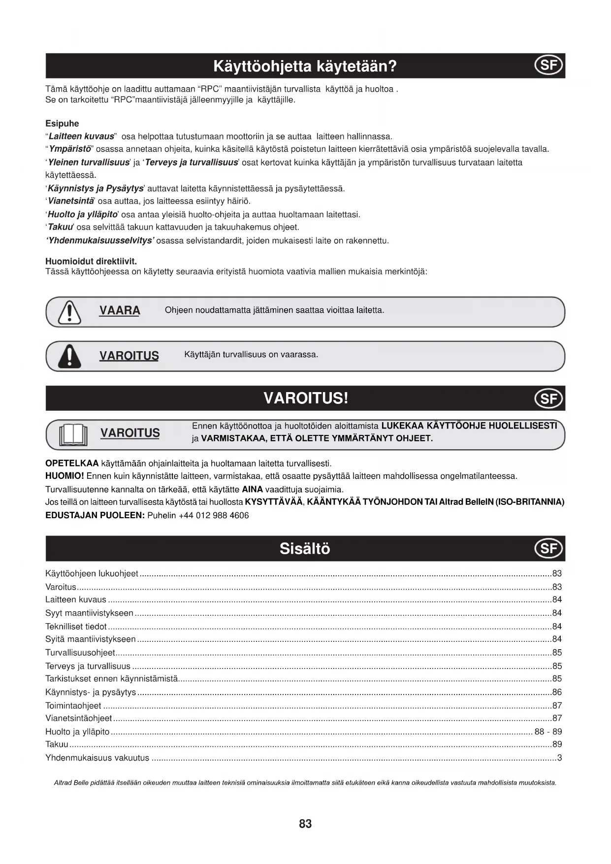 $OWUDG%HOOHSLGlWWllLWVHOOllQRLNHXGHQPXXWWDDODLWWHHQWHNQLVLlRPLQDLVXXNVLDLOPRLWWDPDWWDVLLWlHWXNlWHHQHLNlNDQQDRLNHXGHOOLVWDYDVWXXWDPDKGROOLVLVWDPXXWRNVLVWD OPETELKAA käyttämään ohjainlaitteita ja huoltamaan laitetta turvallisesti. HUOMIO! Ennen kuin käynnistätte laitteen, varmistakaa, että osaatte pysäyttää laitteen mahdollisessa ongelmatilanteessa. Turvallisuutenne kannalta on tärkeää, että käytätte AINA vaadittuja suojaimia. Jos teillä on laitteen turvallisesta käytöstä tai huollosta KYSYTTÄVÄÄ, KÄÄNTYKÄÄ TYÖNJOHDON TAI Altrad BelleIN (ISO-BRITANNIA) EDUSTAJAN PUOLEEN: Puhelin +44 012 988 4606
