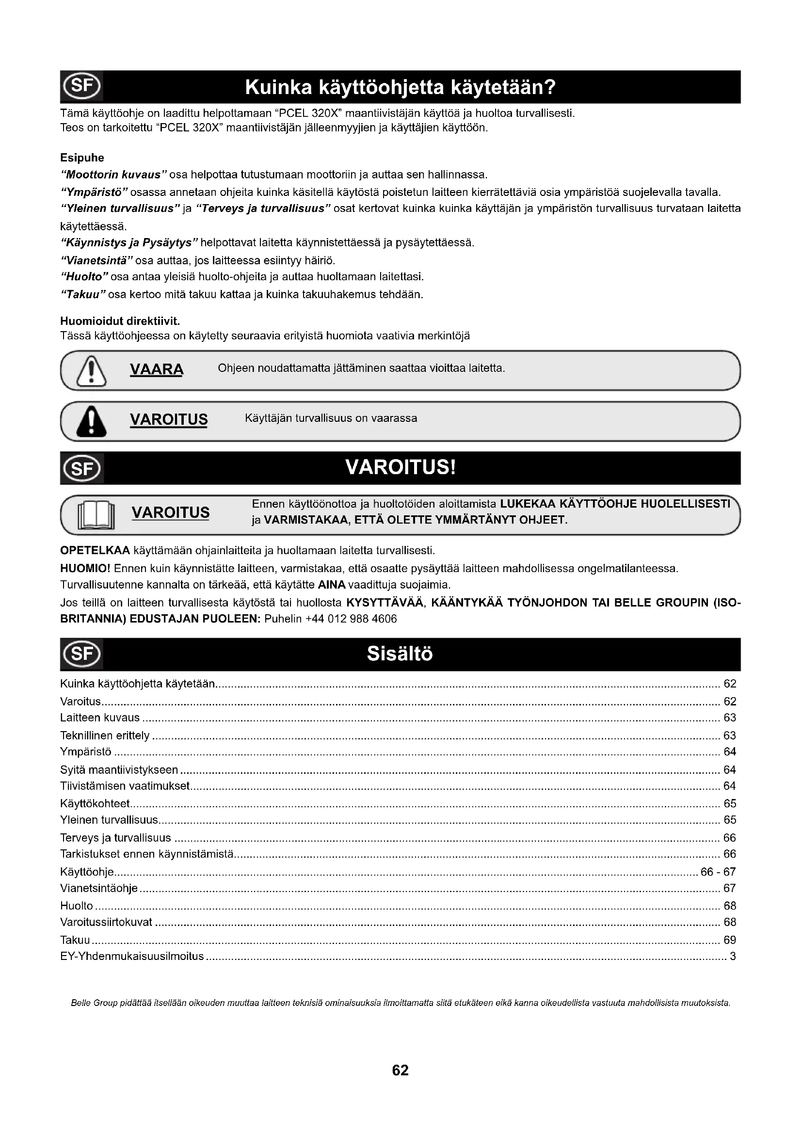 Belle Group pidättää itsellään oikeuden muuttaa laitteen teknisiä ominaisuuksia ilmoittamatta siitä etukäteen eikä kanna oikeudellista vastuuta mahdollisista muutoksista. OPETELKAA käyttämään ohjainlaitteita ja huoltamaan laitetta turvallisesti. HUOMIO! Ennen kuin käynnistätte laitteen, varmistakaa, että osaatte pysäyttää laitteen mahdollisessa ongelmatilanteessa. Turvallisuutenne kannalta on tärkeää, että käytätte AINA vaadittuja suojaimia. Jos teillä on laitteen turvallisesta käytöstä tai huollosta KYSYTTÄVÄÄ, KÄÄNTYKÄÄ TYÖNJOHDON TAI BELLE GROUPIN (ISO- BRITANNIA) EDUSTAJAN PUOLEEN: Puhelin +44 012 988 4606