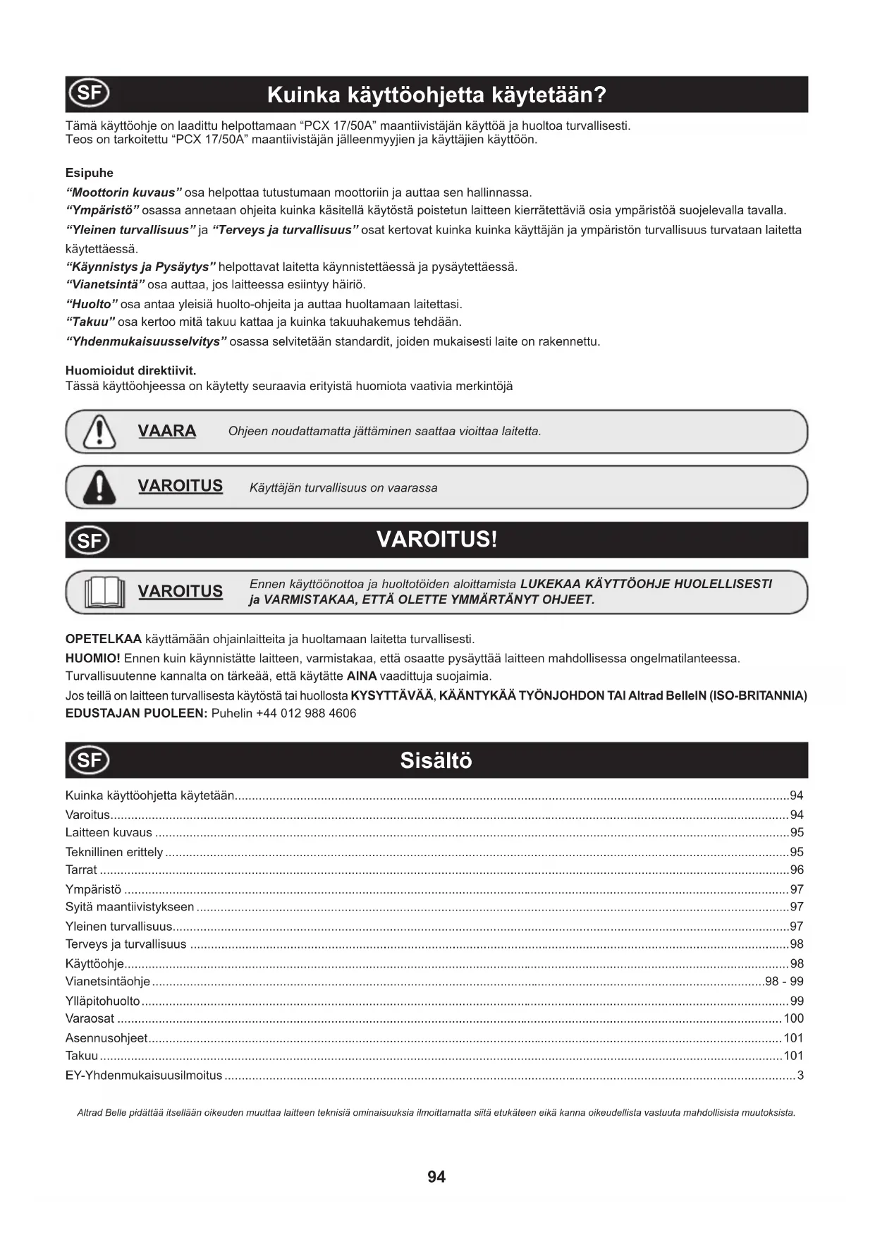 Altrad Belle pidättää itsellään oikeuden muuttaa laitteen teknisiä ominaisuuksia ilmoittamatta siitä etukäteen eikä kanna oikeudellista vastuuta mahdollisista muutoksista. OPETELKAA käyttämään ohjainlaitteita ja huoltamaan laitetta turvallisesti. HUOMIO! Ennen kuin käynnistätte laitteen, varmistakaa, että osaatte pysäyttää laitteen mahdollisessa ongelmatilanteessa. Turvallisuutenne kannalta on tärkeää, että käytätte AINA vaadittuja suojaimia. Jos teillä on laitteen turvallisesta käytöstä tai huollosta KYSYTTÄVÄÄ, KÄÄNTYKÄÄ TYÖNJOHDON TAI Altrad BelleIN (ISO-BRITANNIA) EDUSTAJAN PUOLEEN: Puhelin +44 012 988 4606