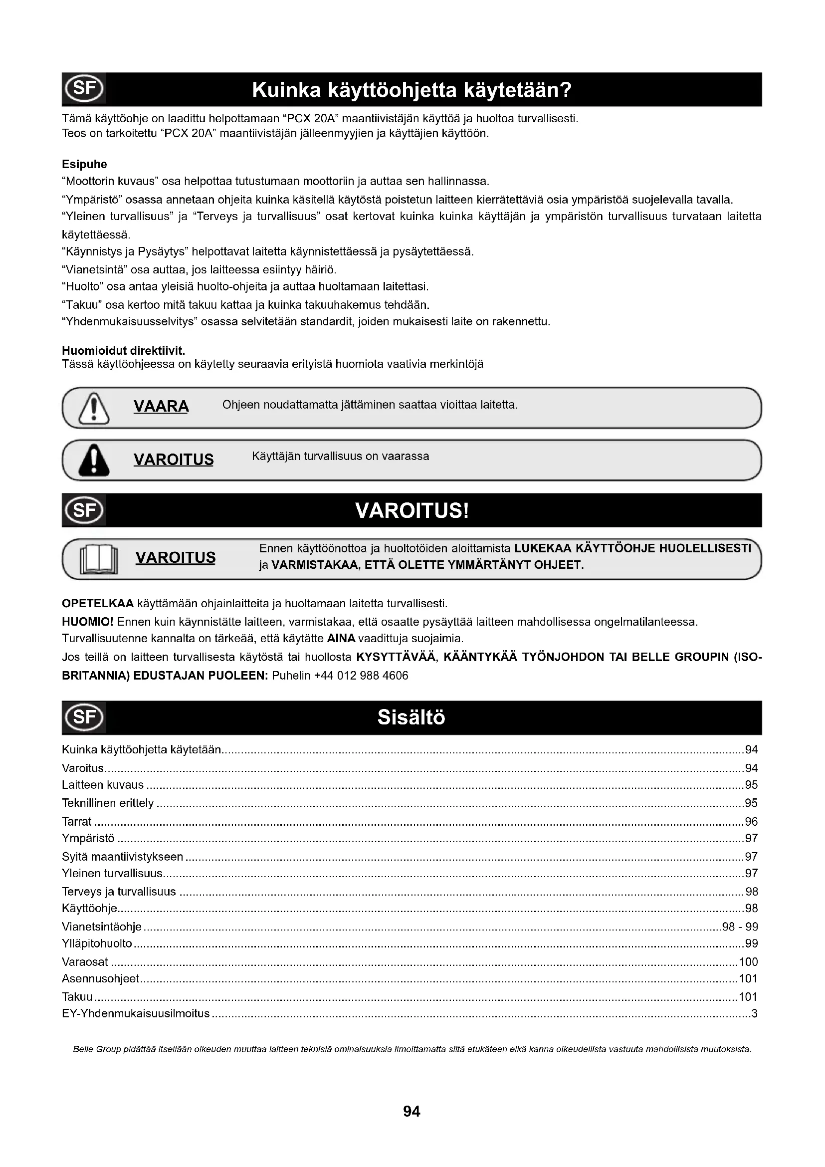 Belle Group pidättää itsellään oikeuden muuttaa laitteen teknisiä ominaisuuksia ilmoittamatta siitä etukäteen eikä kanna oikeudellista vastuuta mahdollisista muutoksista. OPETELKAA käyttämään ohjainlaitteita ja huoltamaan laitetta turvallisesti. HUOMIO! Ennen kuin käynnistätte laitteen, varmistakaa, että osaatte pysäyttää laitteen mahdollisessa ongelmatilanteessa. Turvallisuutenne kannalta on tärkeää, että käytätte AINA vaadittuja suojaimia. Jos teillä on laitteen turvallisesta käytöstä tai huollosta KYSYTTÄVÄÄ, KÄÄNTYKÄÄ TYÖNJOHDON TAI BELLE GROUPIN (ISO- BRITANNIA) EDUSTAJAN PUOLEEN: Puhelin +44 012 988 4606