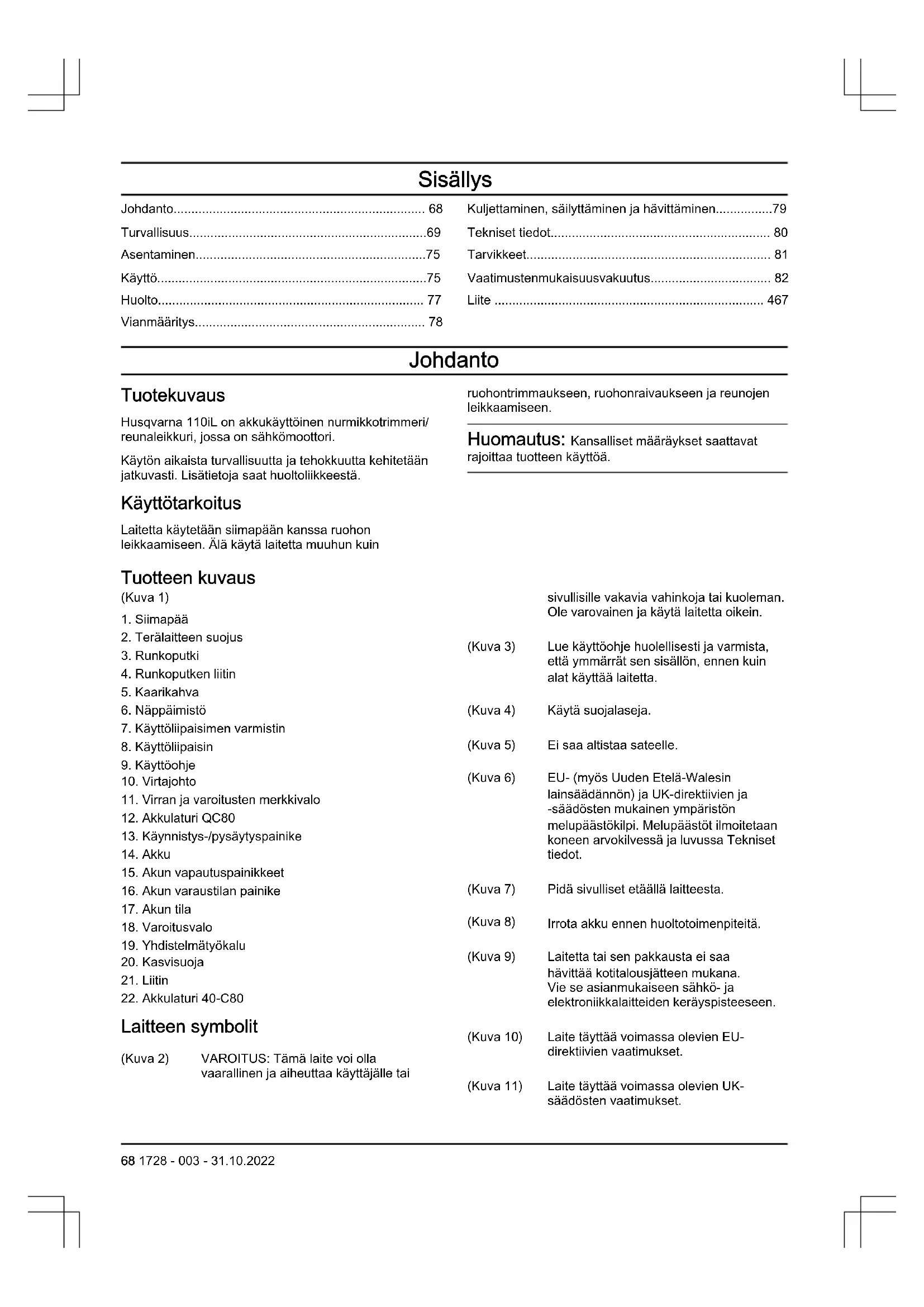 - Huskvarna, 2022-07-05 Claes Losdal, FoU-leder, Husqvarna AB Ansvarlig for teknisk dokumentasjon 1728 - 003 - 31.10.2022 67Sisällys Johdanto p. 68