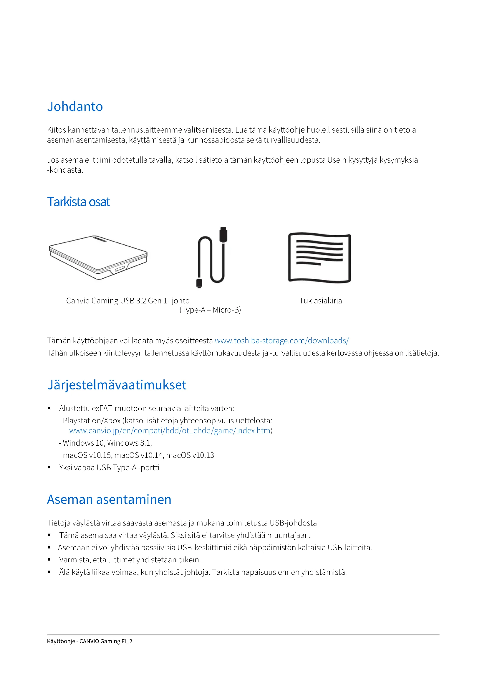 Kun yritän alustaa aseman, näkyviin tulee Could not complete format (Ei voi alustaa) -ilmoitus. V: Syynä voi olla aseman alustaminen FAT-tiedostojärjestelmään. Valitse NTFS-tiedostojärjestelmä. Sen pitäisi ratkaista ongelma. TOSHIBA-tuotetuki Tarvitsetko apua? Lisätietoja on TOSHIBA-kiintolevyjen ja -tallennuslaitteiden tukisivulla osoitteessa www.toshiba-storage.com/support Lisätietoja takuusta: www.toshiba-storage.com/warranty-claims Kun alustat aseman, kaikki tiedot poistetaan siitä. HUOMAUTUSKäyttöohje - CANVIO Gaming FI_6 Asetusten vaatimat ilmoitukset CE-vaatimukset Työskentely-ympäristö Tämä tuote on suunniteltu täyttämään sähkömagneettista yhteensopivuutta koskevat vaatimukset (EMC) asuinympäristöissä, kaupallisissa ympäristöissä ja kevyen teollisuuden ympäristöissä. Toshiba ei ole perehtynyt tämän laitteen käyttämiseen muualla. Käyttämistä muualla ei suositella, ja tällainen käyttäminen voi olla rajoitettua. Tämän laitteen käyttäminen muualla voi aiheuttaa häiriöitä muille lähellä oleville laitteille, toimintavirheitä tai tietojen katoamista. Laitteen käyttämistä ei ole tutkittu esimerkiksi seuraavissa ympäristöissä: Teollinen ympäristö (käytetään lähinnä 3-vaiheista 380 voltin virtaa): Suurien koneiden aiheuttamat voimakkaat sähkömagneettiset kentät voivat häiritä tämän laitteen toimintaa. Lääketieteelliset ympäristöt: Toshiba ei ole tutkinut, noudattaako tämä laite lääketieteellisiä laitteita säätevän direktiivin vaikutuksia. Siksi tämän laitteen ei katsota täyttävän lääketieteen asettamia vaatimuksia. Laitteen käyttäminen esimerkiksi sairaalan toimistotiloissa ei aiheuta ongelmia, jos sitä ei ole kielletty. Autot: Tarkista auton käyttöohjeesta, mitä siinä sanotaan tällaisten tuotteiden käyttämisestä. Ilmailu: Noudata matkustamohenkilöstön antamia ohjeita käyttämisestä lennon aikana. Muut ympäristöt Käyttäminen ulkona: Koska tämä laite on suunniteltu käytettäväksi kotona tai toimistossa, sitä ei ole suojattu kosteudelta eikä voimakkailta iskuilta. Käyttäminen räjähtävien aineiden lähellä: Tämän tuotteen käyttäminen ei ole sallittua paikoissa, joissa vallitsee räjähdysvaara. Seuraavat tiedot on tarkoitettu vain EU-jäsenmaiden asukkaille: REACH-vaatimustenmukaisuusvakuutus Toshiba täyttää kaikki REACH-vaatimukset (Registration, Evaluation, Authorization and Restriction of Chemicals) ja sitoutuu antamaan asiakkaille tietoja tuotteissaan käytettävistä kemikaaleista REACH-määräysten mukaisesti. Tuotteiden hävittäminen Seuraavat tiedot koskevat vain Turkkia: Täyttää AEEE-säädöksen määräykset. Tälle tuotteelle on myönnetty CE-merkintä asianomaisten EU-direktiivien mukaisesti. CE-merkinnästä vastaa Toshiba Electronics Europe GmbH, Hansaallee 181, 40549 Düsseldorf, Saksa. Tämä merkki ilmaisee, että tätä tuotetta ei saa hävittää kotitalousjätteiden mukana. Autat estämään tämän tuotteen epäasianmukaisen hävittämisen aiheuttamia mahdollisia vahingollisia seurauksia ympäristölle ja ihmisten terveydelle varmistamalla, että tämä tuote kierrätetään oikein. Lisätietoja tuotteen kierrättämisestä saa asianmukaisilta viranomaisilta, kotitalousjätteen kierrätyspalvelulta tai liikkeestä, josta tuote ostettiin.Ota huomioon ©2020 TOSHIBA Electronics Europe GmbH. Kaikki oikeudet pidätetään. TOSHIBA pidättää itsellään oikeuden tehdä teknisiä muutoksia. TOSHIBA ei vastaa virheistä, jotka aiheutuvat suoranaisesti tai epäsuorasti tämän tuotteen ja sen dokumentaation välisistä virheistä tai puutteista. Toshiba-nimi ja -logot ovat Toshiban rekisteröityjä tavaramerkkejä. macOS on Apple Inc:in tavaramerkki. Muut yritysnimet, tuotenimet ja palveluiden nimet voivat olla niiden omistajayritysten tuotemerkkejä. Tuotteen tekniset tiedot, määritelmät, värit, komponentit ja palvelu voivat muuttua ilman erillistä ilmoitusta. Yksi gigatavu (Gt) tarkoittaa miljardia tavua ja yksi teratavu (Tt) tarkoittaa biljoonaa tavua. Käytettävissä oleva kokonaiskapasiteetti vaihtelee käyttöympäristön mukaan, ja tulokset ja tallennuskapasiteetti vaihtelevat vastaavasti. Tietokoneen käyttöjärjestelmä kuitenkin ilmoittaa tallennuskapasiteetin käyttämällä 2:n potensseja 1Tt = 2