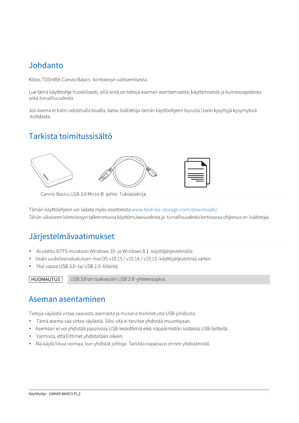 - Asetusten vaatimat ilmoitukset Käyttöohje - CANVIO BASICS FI_2 Johdanto Kiitos TOSHIBA Canvio Basics -kiintolevyn valitsemisesta. Lue tämä käyttöohje huolellisesti, sillä siinä on tietoja aseman asentamisesta, käyttämisestä ja kunnossapidosta sekä turvallisuudesta. Jos asema ei toimi odotetulla tavalla, katso lisätietoja tämän käyttöohjeen lopusta Usein kysyttyjä kysymyksiä -kohdasta. Tarkista toimitussisältö Tämän käyttöohjeen voi ladata myös osoitteesta www.toshiba-storage.com/downloads/ Tähän ulkoiseen kiintolevyyn tallennetussa käyttömukavuudesta ja -turvallisuudesta kertovassa ohjeessa on lisätietoja. Järjestelmävaatimukset Alustettu NTFS-muotoon Windows 10- ja Windows 8.1 -käyttöjärjestelmälle Vaatii uudelleenalustuksen macOS v10.15 / v10.14 / v10.13 -käyttöjärjestelmiä varten Yksi vapaa USB 3.0- tai USB 2.0 -liitäntä Aseman asentaminen Tietoja väylästä virtaa saavasta asemasta ja mukana toimitetusta USB-johdosta: Tämä asema saa virtaa väylästä. Siksi sitä ei tarvitse yhdistää muuntajaan. Asemaan ei voi yhdistää passiivisia USB-keskittimiä eikä näppäimistön kaltaisia USB-laitteita. Varmista, että liittimet yhdistetään oikein. Älä käytä liikaa voimaa, kun yhdistät johtoja. Tarkista napaisuus ennen yhdistämistä. USB 3.0 on taaksepäin USB 2.0 -yhteensopiva. Canvio Basics USB 3.0 Micro-B -johto Tukiasiakirja HUOMAUTUSKäyttöohje - CANVIO BASICS FI_3 Aseman yhdistäminen tietokoneeseen p. 6