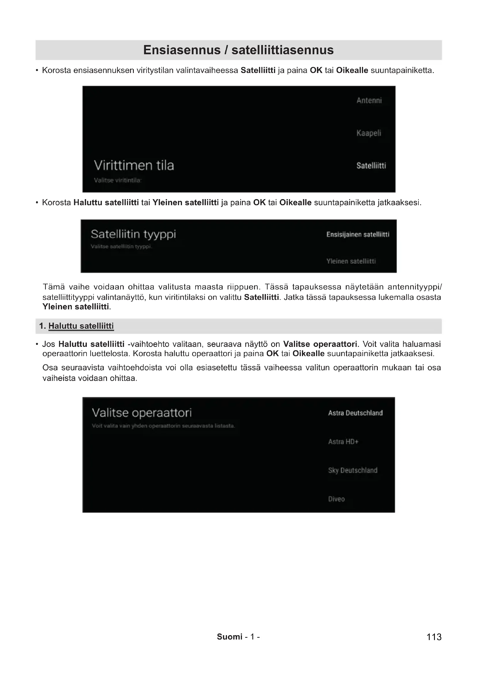 - Jos Haluttu satelliitti -vaihtoehto valitaan, seuraava näyttö on Valitse operaattori. Voit valita haluamasi operaattorin luettelosta. Korosta haluttu operaattori ja paina OK tai Oikealle suuntapainiketta jatkaaksesi. Osa seuraavista vaihtoehdoista voi olla esiasetettu tässä vaiheessa valitun operaattorin mukaan tai osa vaiheista voidaan ohittaa. 113Suomi - 2 - 1.1. Antennityyppi - Suora
