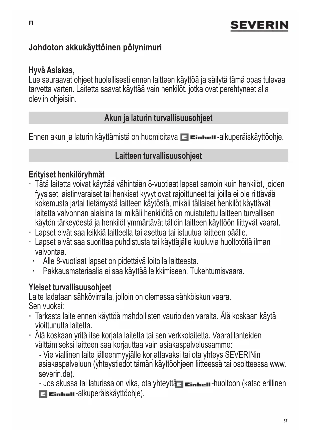 Artikelnummer Beskrivning ZB 7260 Utbytesbatteri 2,5 Ah ZB 7261 Utbytesbatteri 3,0 Ah ZB 7262 Filtersats (Hepa-lter med lter och dammbehål-lare) ZB 7263 Dammltersats (6 dammpåsar) ZB 7264 Turbo-möbelmunstycke ZB 7265 Golvmunstycke för hårda golv med borstvals ZB 7266 Variabelt möbelmunstycke ZB 7267 Påslös dammbehållare ZB 7268 Dammbehållare med påse 5729-048 HEPA-lter, separat 5731-048 Golvmunstycke med borstvals 5732-048 Borstvals för golvmunstycke 5731-048 9168-048 Nätdel 5734-048 Mjuk borstrulle för munstycke för hårda golv ZB 7265 Avfallshantering och garanti Avfallshantera apparaten och ackumulatorn separat. Apparat och ackumulatorer som är märkta med denna symbol, får inte kastas i hushållssoporna! Apparat och ackumulatorer innehåller värdefulla råämnen som kan återanvändas. En korrekt avfallshantering skyddar miljön och era medmänniskors hälsa. Lämna in apparat och utmonterade ackumulatorer separat till respektive insamlingsställen. Garanti i Sverige och Finland (Enhet) För material- och tillverkningsfel gäller 2 års garanti räknat från inköpsdagen mot uppvisande av specicerat inköpskvitto i överensstämmelse med de allmänna garantivillkoren. Denna garanti inverkar inte på dina lagstadgade rättigheter eller dina lagenliga rättigheter enligt den nationella konsumentskyddslagstiftningen. Ifall apparaten används felaktigt, eller vårdslöst, ansvarar den som använder apparaten för eventuella material- och personskador. Tillverkas för: Severin Elektrogeräte GmbH, Tyskland. Batterier och ackumulatorer är undantagna från garantin, när de på grund av normal förslitning eller felaktig hantering går sönder eller dess livslängd förkortas. Garanti (batteri och laddare) Garantiinformation för batteri och laddare nns i den medföljande originalbruksanvisningen .67 142 x 208 mm Johdoton akkukäyttöinen pölynimuri Hyvä Asiakas, Lue seuraavat ohjeet huolellisesti ennen laitteen käyttöä ja säilytä tämä opas tulevaa tarvetta varten. Laitetta saavat käyttää vain henkilöt, jotka ovat perehtyneet alla oleviin ohjeisiin. Akun ja laturin turvallisuusohjeet Ennen akun ja laturin käyttämistä on huomioitava -alkuperäiskäyttöohje. Laitteen turvallisuusohjeet Erityiset henkilöryhmät ∙ Tätä laitetta voivat käyttää vähintään 8-vuotiaat lapset samoin kuin henkilöt, joiden fyysiset, aistinvaraiset tai henkiset kyvyt ovat rajoittuneet tai joilla ei ole riittävää kokemusta ja/tai tietämystä laitteen käytöstä, mikäli tällaiset henkilöt käyttävät laitetta valvonnan alaisina tai mikäli henkilöitä on muistutettu laitteen turvallisen käytön tärkeydestä ja henkilöt ymmärtävät tällöin laitteen käyttöön liittyvät vaarat. ∙ Lapset eivät saa leikkiä laitteella tai asettua tai istuutua laitteen päälle. ∙ Lapset eivät saa suorittaa puhdistusta tai käyttäjälle kuuluvia huoltotöitä ilman valvontaa. ∙ Alle 8-vuotiaat lapset on pidettävä loitolla laitteesta. ∙ Pakkausmateriaalia ei saa käyttää leikkimiseen. Tukehtumisvaara. Yleiset turvallisuusohjeet Laite ladataan sähkövirralla, jolloin on olemassa sähköiskun vaara. Sen vuoksi: ∙ Tarkasta laite ennen käyttöä mahdollisten vaurioiden varalta. Älä koskaan käytä vioittunutta laitetta. ∙ Älä koskaan yritä itse korjata laitetta tai sen verkkolaitetta. Vaaratilanteiden välttämiseksi laitteen saa korjauttaa vain asiakaspalvelussamme: - Vie viallinen laite jälleenmyyjälle korjattavaksi tai ota yhteys SEVERINin asiakaspalveluun (yhteystiedot tämän käyttöohjeen liitteessä tai osoitteessa www. severin.de). - Jos akussa tai laturissa on vika, ota yhteyttä -huoltoon (katso erillinen -alkuperäiskäyttöohje). FI68 142 x 208 mm ∙ Älä upota laitetta veteen tai muihin nesteisiin äläkä käsittele sitä nesteillä. Suojaa laite sateelta ja kosteudelta. Älä käytä laitetta ulkona tai tiloissa, joissa on suuri ilmankosteus. ∙ Älä tartu laitteeseen märin käsin. ∙ Kytke laite pois päältä ennen laitteen puhdistamista tai huoltoa ja ennen lisävarusteiden vaihtamista. Pyörivä harjarulla Laitteessa on moottorikäyttöinen harjatela lattia- ja pehmustesuulakkeessa. Harjarullasta voi aiheutua tapaturmia. Noudata tämän vuoksi seuraavia ohjeita: ∙ Varmista ennen laitteen puhdistusta tai huoltoa, että laite on kytketty pois päältä. ∙ Huolehdi siitä, että kehon osat eivät voi jäädä missään tilanteessa harjarullan alle. ∙ Älä imuroi johtojen ja pitkien hapsujen lähellä. Tällöin on vaarana johtojen eristyksen vaurioituminen. Edellä mainitut kohteet voivat lisäksi takertua kiinni harjarullaan ja vahingoittaa siten laitetta. ∙ Jos jotain imetään vahingossa sisään, harjatela juuttuu ja laite kytkeytyy turvallisuussyistä automaattisesti pois päältä. LED-valaistus Lattiasuulakkeeseen on asennettu LED-lamppuja, jotka valaisevat lattiasuulakkeen edessä olevan työalueen. ∙ Älä katso käytön aikana LED-lamppuja kohti. ∙ LED-lamppuja ei voi vaihtaa. Käyttötarkoitus ∙ Laite on tarkoitettu vain kotitalouskäyttöön. ∙ Laitetta saa käyttää puhdistamiseen vain tasaisella, normaalisti likaantuneella pinnalla, lyhytnukkaisella matolla, verhoilulla tai muulla tässä käyttöohjeessa kuvatulla pinnalla, joka kestää pyörivästä harjasta aiheutuvan rasituksen vahingoittumatta. ∙ Muunlainen käyttö katsotaan laitteelle määritellyn käyttötarkoituksen vastaiseksi ja on siksi kiellettyä. Tapaturmien, tulipalojen ja vahinkojen välttämiseksi laitteella ei saa imuroida seuraavia kohteita: ∙ Ihmiset, eläimet tai kasvit. Pidä laite aina loitolla ruumiinosista, hiuksista ja vaatekappaleista (esim. kengännauhoista). Älä imuroi pään lähellä. ∙ hehkuvaa, palavaa tai kytevää ainesta (esim. tuhkaa, hiiltä, puuhiiltä, savukkeita tai tulitikkuja).69 142 x 208 mm ∙ helposti räjähtäviä tai syttyviä aineita tai tulostinmustetta. ∙ vettä tai muita nesteitä, esi
