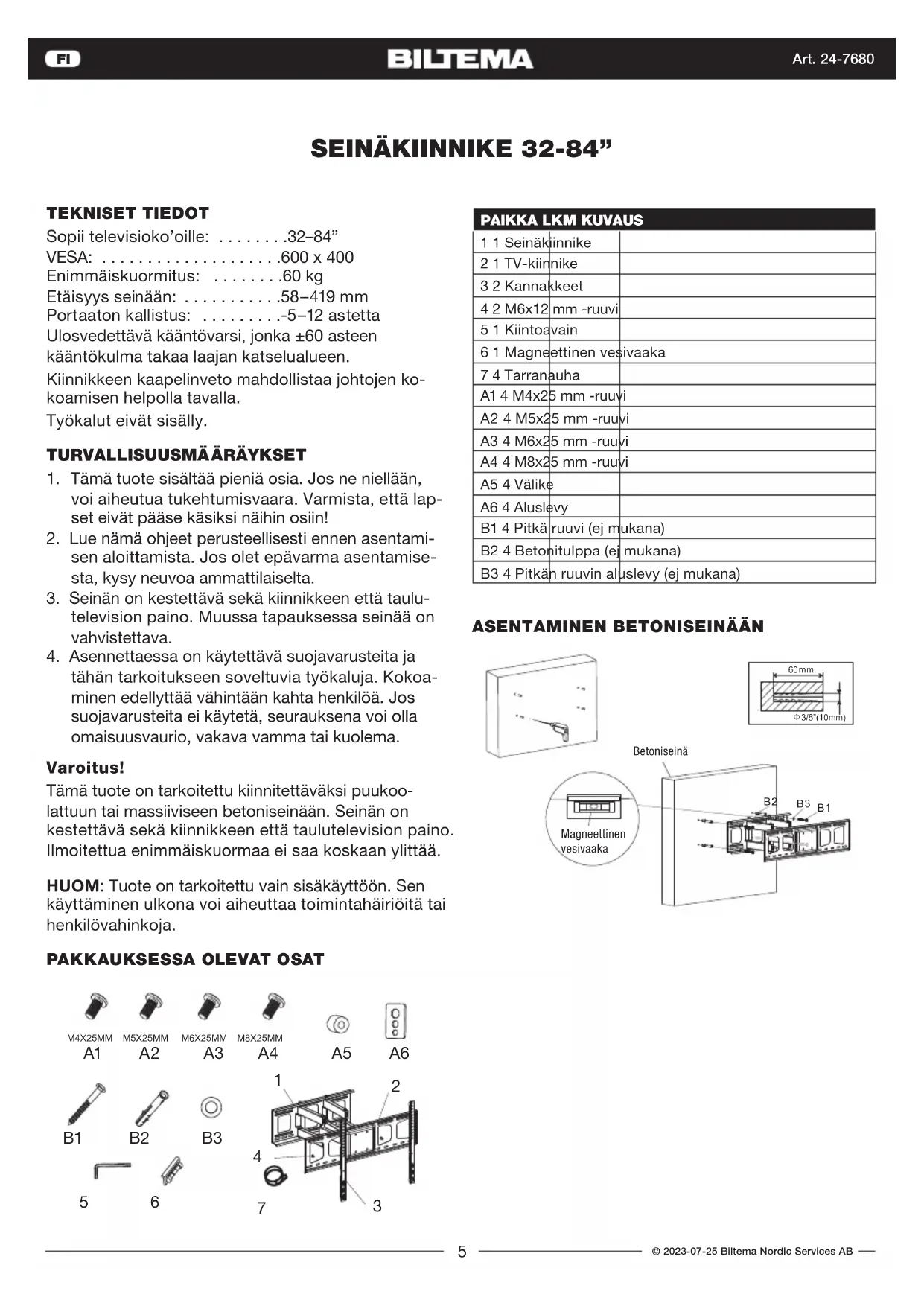 A1-A4 -5~12° ±3°TVB3B1 VAROITUS! Mikäli TV:n VESA-reikä on litteä, käytä lyhyitä ruuveja (ei sisälly). Seinän välituki Magneettinen vesivaakaAluslevySuuri reikä M8-ruuveille Pieni reikä M4-ruuveilleKeskisuuri reikä M5- ja M6-ruuveilleAluslevySuuri reikä M8-ruuveille Pieni reikä M4-ruuveilleKeskisuuri reikä M5- ja M6-ruuveilleM6x12 mm-ruuviTarranauhaKaapeli5x5 KiintoavainKannakkeetSeinäTV-kiinnikeArt. 24-7680