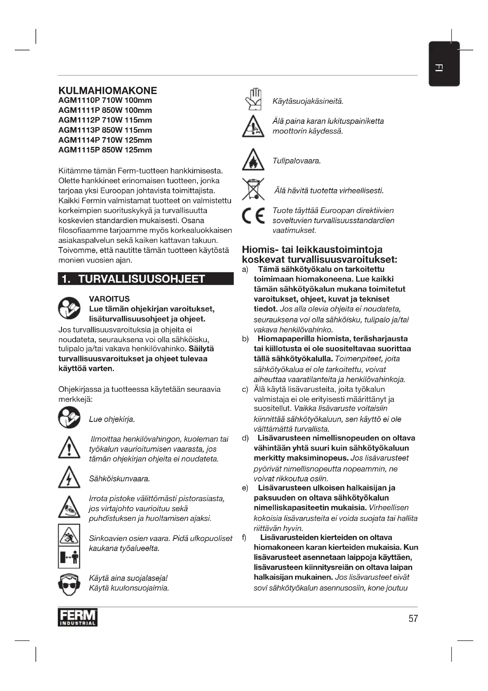 KULMAHIOMAKONE AGM1110P 710W 100mm AGM1111P 850W 100mm AGM1112P 710W 115mm AGM1113P 850W 115mm AGM1114P 710W 125mm AGM1115P 850W 125mm Kiitämme tämän Ferm-tuotteen hankkimisesta. Olette hankkineet erinomaisen tuotteen, jonka tarjoaa yksi Euroopan johtavista toimittajista. Kaikki Fermin valmistamat tuotteet on valmistettu korkeimpien suorituskykyä ja turvallisuutta koskevien standardien mukaisesti. Osana filosofiaamme tarjoamme myös korkealuokkaisen asiakaspalvelun sekä kaiken kattavan takuun. Toivomme, että nautitte tämän tuotteen käytöstä monien vuosien ajan.