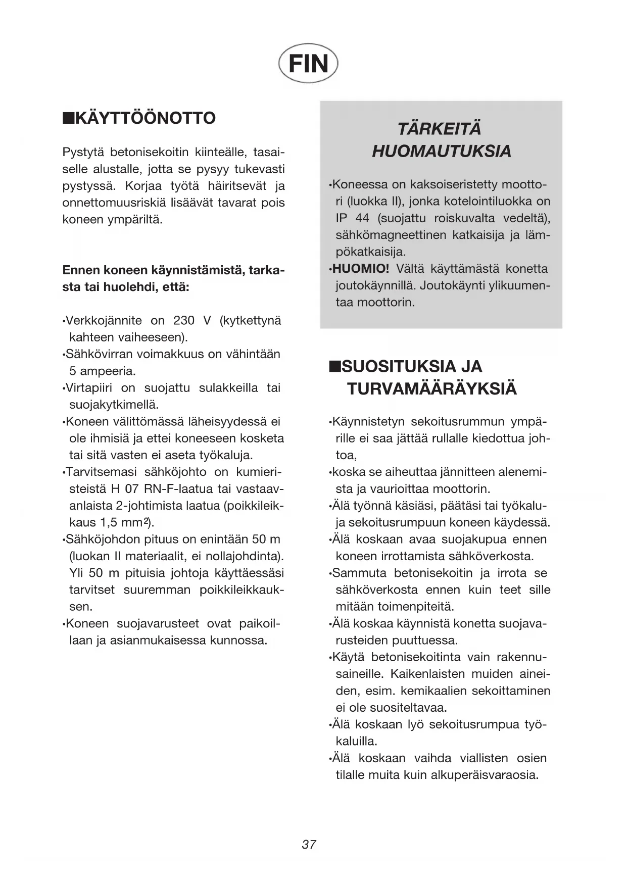 - Koneen suojavarusteet ovat paikoil- laan ja asianmukaisessa kunnossa. TÄRKEITÄ HUOMAUTUKSIA