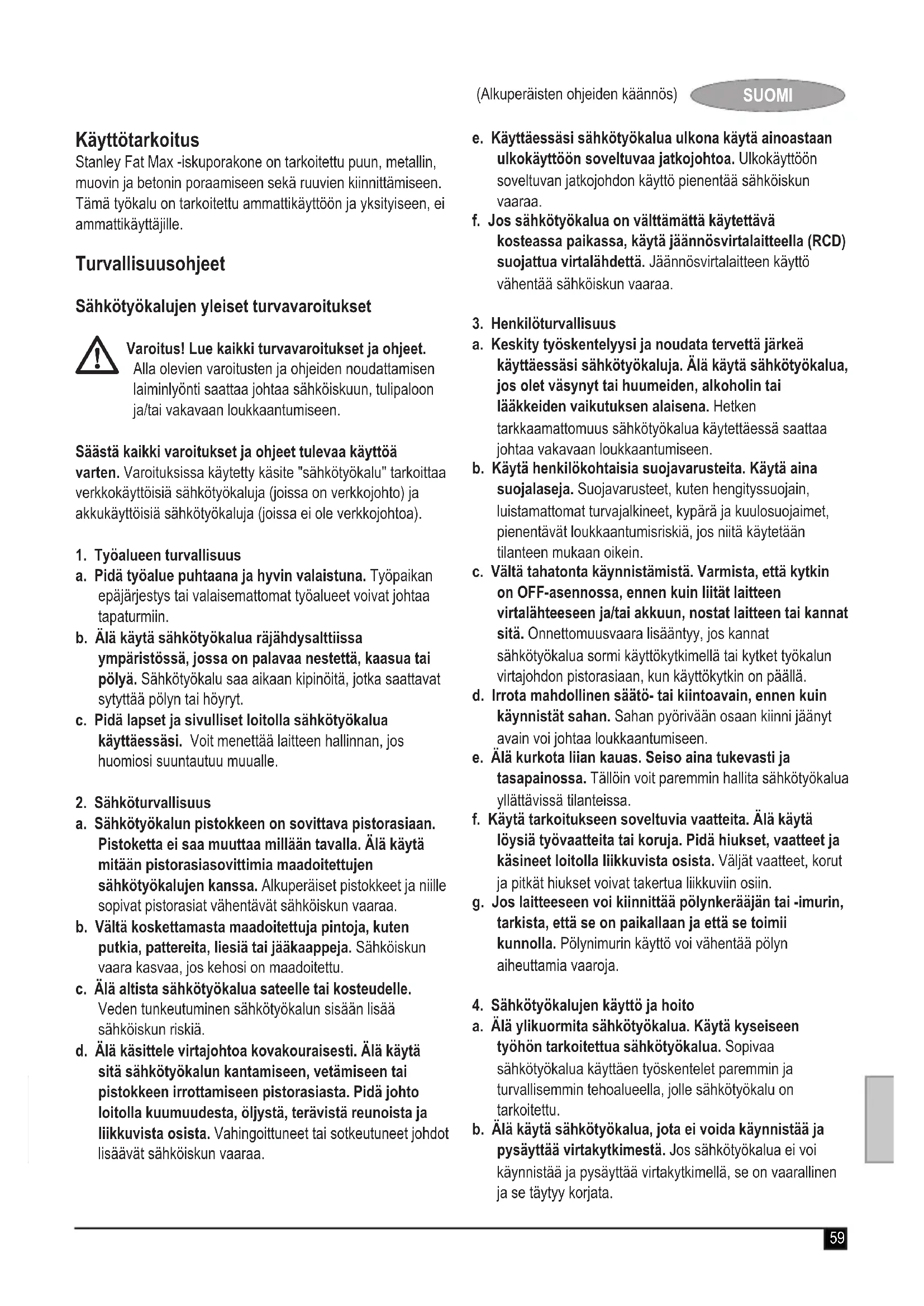 (Alkuperäisten ohjeiden käännös) SUOMI Käyttötarkoitus Stanley Fat Max -iskuporakone on tarkoitettu puun, metallin, muovin ja betonin poraamiseen sekä ruuvien kiinnittämiseen. Tämä työkalu on tarkoitettu ammattikäyttöön ja yksityiseen, ei ammattikäyttäjille. Turvallisuusohjeet Sähkötyökalujen yleiset turvavaroitukset