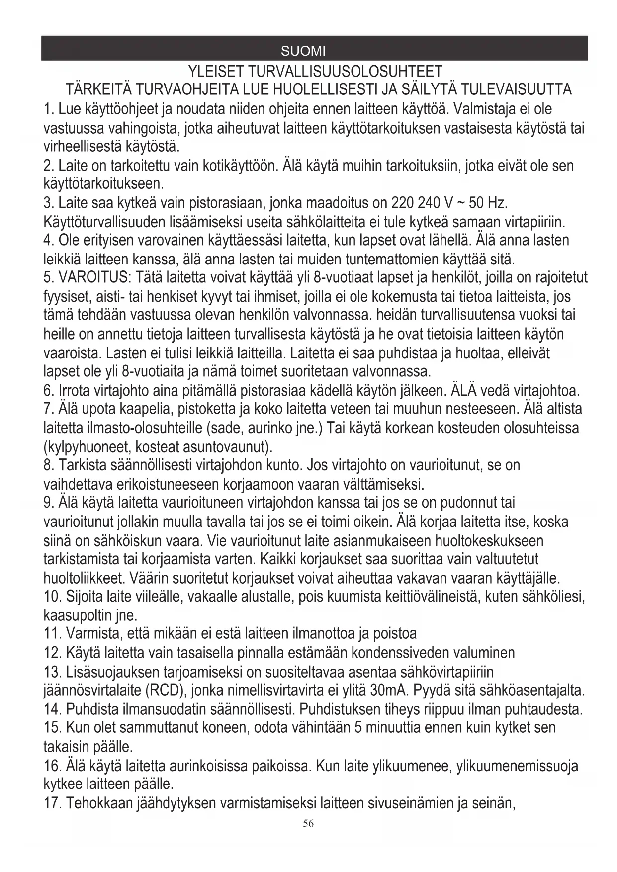 fyysiset, aisti- tai henkiset kyvyt tai ihmiset, joilla ei ole kokemusta tai tietoa laitteista, jos tämä tehdään vastuussa olevan henkilön valvonnassa. heidän turvallisuutensa vuoksi tai heille on annettu tietoja laitteen turvallisesta käytöstä ja he ovat tietoisia laitteen käytön vaaroista. Lasten ei tulisi leikkiä laitteilla. Laitetta ei saa puhdistaa ja huoltaa, elleivät lapset ole yli 8-vuotiaita ja nämä toimet suoritetaan valvonnassa. SUOMI 56e) Irrota ilmastointilaite ennen huoltoa.