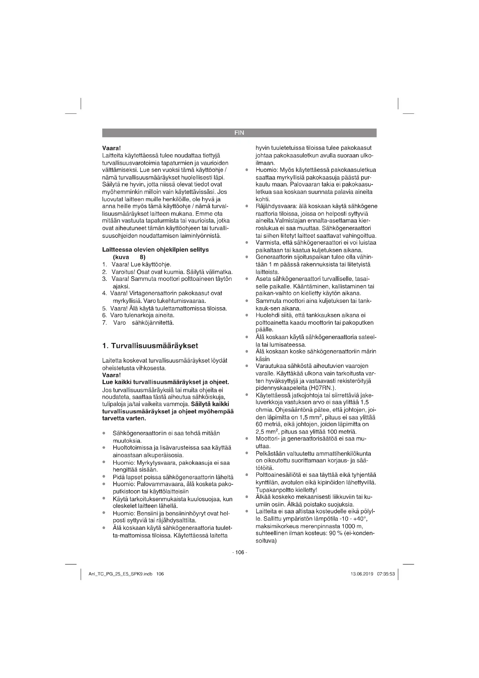 Räjähdysvaara: älä koskaan käytä sähkögene raattoria tiloissa, joissa on helposti syttyviä aineita.Valmistajan ennalta-asettamaa kier- roslukua ei saa muuttaa. Sähkögeneraattori tai siihen liitetyt laitteet saattavat vahingoittua.