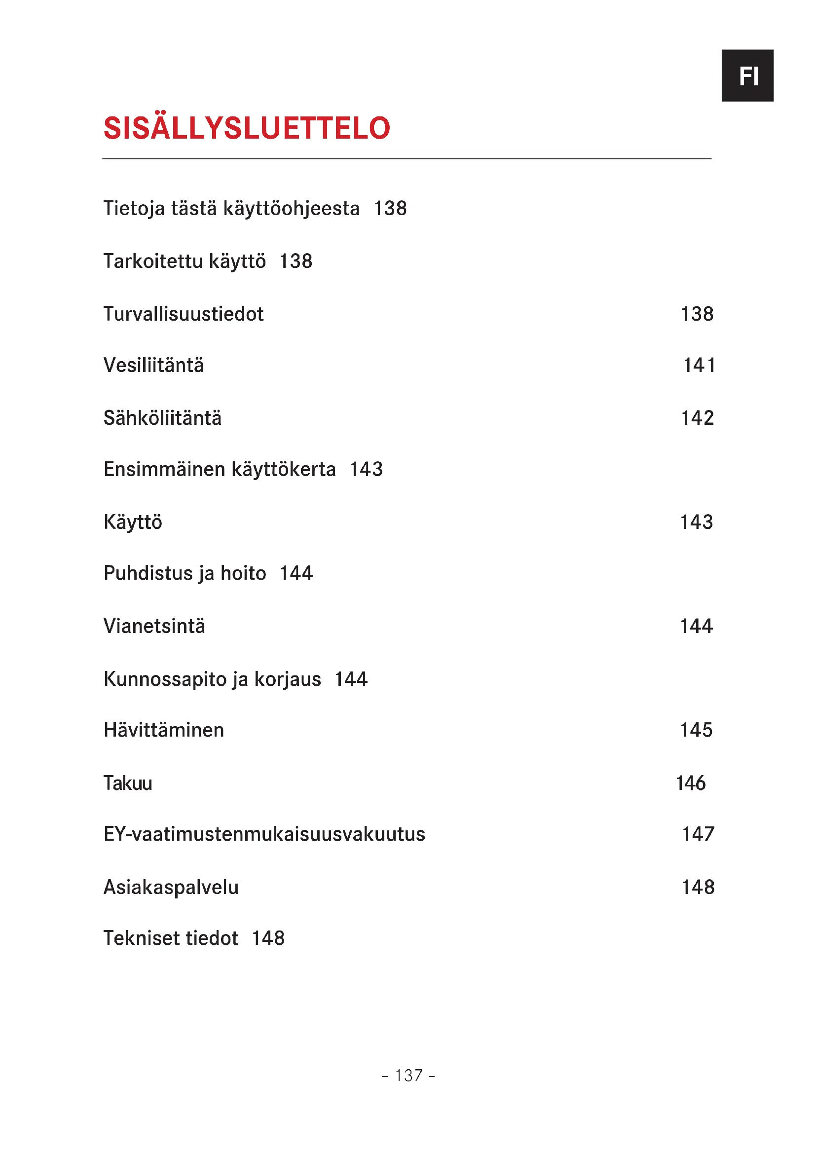 SISÄLLYSLUETTELO Tietoja tästä käyttöohjeesta 138 Tarkoitettu käyttö 138 Turvallisuustiedot 138 Vesiliitäntä 141 Sähköliitäntä 142 Ensimmäinen käyttökerta 143 Käyttö 143 Puhdistus ja hoito 144 Vianetsintä 144 Kunnossapito ja korjaus 144 Hävittäminen 145 Takuu 146 EY-vaatimustenmukaisuusvakuutus 147 Asiakaspalvelu 148 Tekniset tiedot 148– 138 –