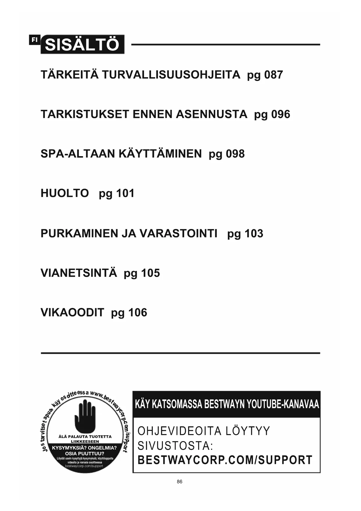 - Suojaa spa-allas suoralta auringonvalolta peitteellä, kun allas ei ole käytössä. TUOTEVAROITUS VAROITUS: Tarkista ennen pistokkeen työntämistä virtapistokkeeseen, että virtalähteen jännite on pumpun kannalta oikea. VAROITUS: Jatkojohdon tai usean pistokkeen sovittimen käyttäminen altaan lämmittimen kanssa voi aiheuttaa sovittimen ylikuumenemisen, mikä voi vahingoittaa laitteistoa ja ympärillä olevia esineitä. Spa-allas on luokan I sähkölaite ja se on liitettävä suoraan maadoitettuun pistorasiaan. On suositeltavaa käyttää ainoastaan pistorasioita, jotka ovat kosteudenkestäviä ja high power loading -yhteensopivia. Tarkista pistoke ja pistorasia säännöllisesti vaurioiden varalta, ennen kuin käytät allasta. Älä käytä spa-allasta, jos pistoke tai pistorasia on vahingoittunut. Jos olet epävarma sähkövirtaan liittyvistä asioista, ota yhteyttä valtuutettuun sähköalan ammattilaiseen ennen spa-altaan käyttöä. VAROITUS: PRCD-pistoke on testattava aina ennen käyttöä. Näin voidaan välttää sähköiskun vaara. VAROITUS: Älä käytä pistoketta, jos se ei läpäise testiä. Saat lisätietoja ja apua sivustomme Support-osasta osoitteessa www.bestwaycorp.com. SISÄLTÖ