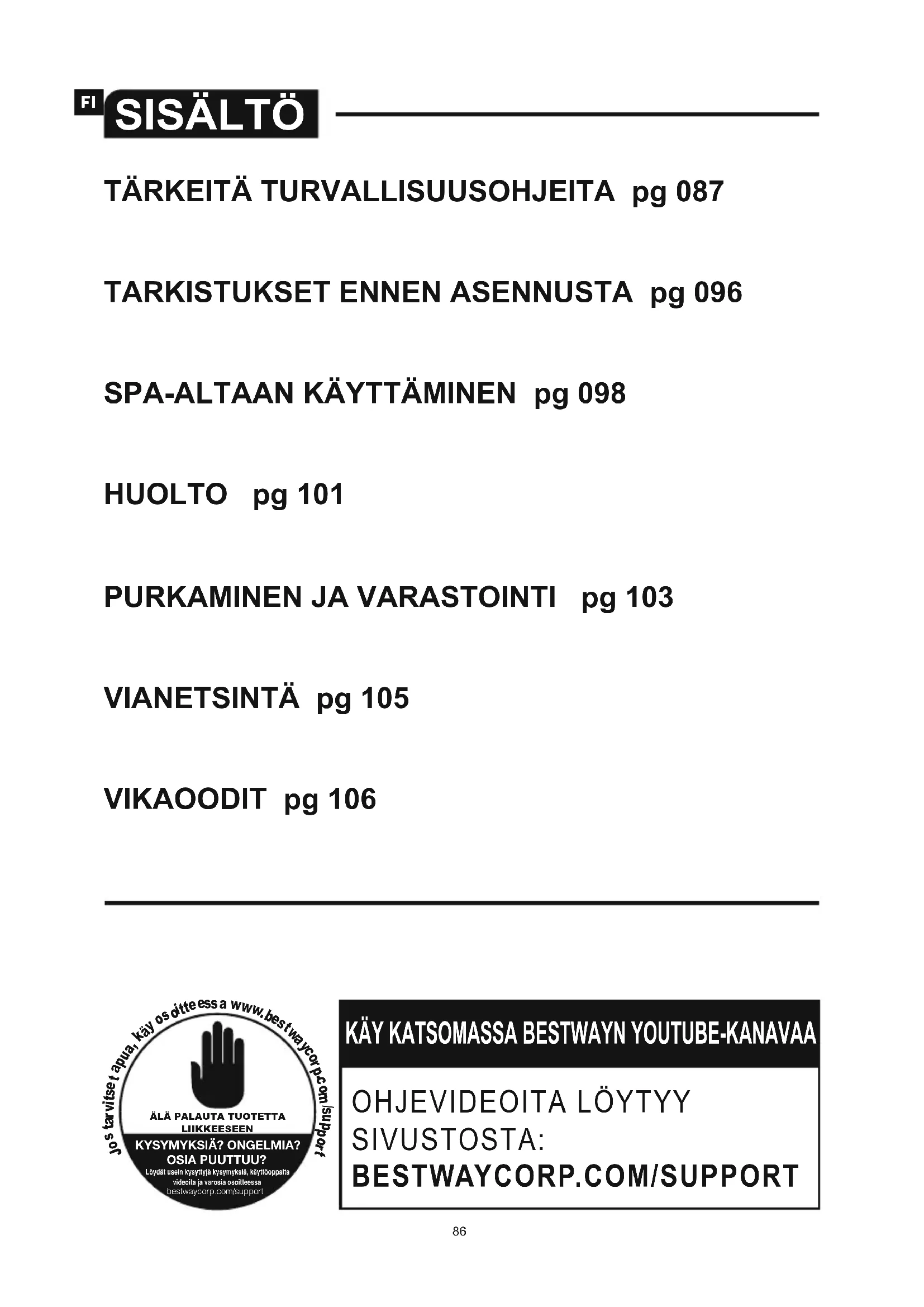 Für weitere Hilfe besuchen Sie bitte den Bereich “Unterstützung” auf unserer Webseite, www.bestwaycorp.deTURVAOHJEET Lue huolellisesti kaikki tämän käyttöoppaan ohjeet ja ymmärrä ja noudata niitä ennen spa-altaan asentamista ja käyttämistä.