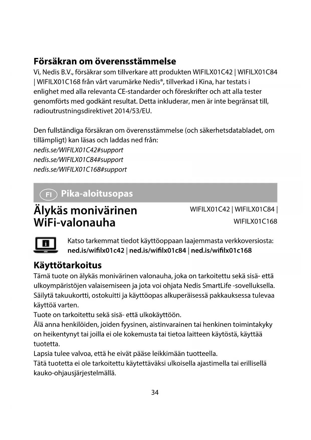 Vaatimustenmukaisuusvakuutus Nedis B.V. ilmoittaa valmistajana, että tuote WIFILX01C42 | WIFILX01C84 | WIFILX01C168 tuotemerkistämme Nedis®, valmistettu Kiinassa, on testattu kaikkien asiaankuuluvien CE-standardien ja määräysten mukaisesti ja tuote on läpäissyt kaikki testit. Tämä sisältää RED 2014/53/EU -direktiivin siihen kuitenkaan rajoittumatta. Täydellinen vaatimustenmukaisuusvakuutus (ja käyttöturvallisuustiedote, mikäli käytettävissä) on saatavilla ja ladattavissa osoitteesta: nedis./WIFILX01C42#support nedis./WIFILX01C84#support nedis./WIFILX01C168#support38