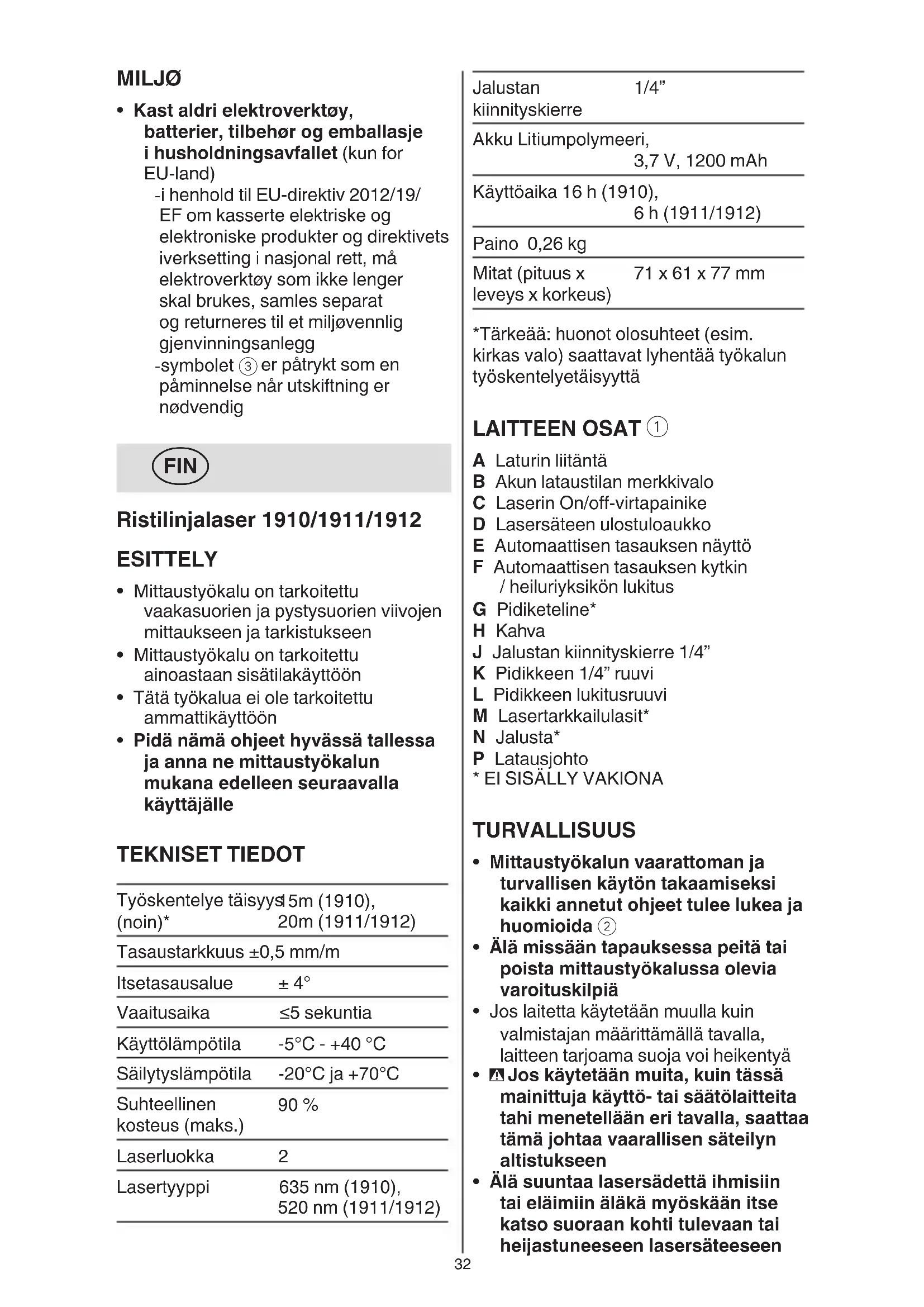 - Pidä nämä ohjeet hyvässä tallessa ja anna ne mittaustyökalun mukana edelleen seuraavalla käyttäjälle TEKNISET TIEDOT Työskentelye täisyys (noin)* 15m (1910), 20m (1911/1912) Tasaustarkkuus ±0,5 mm/m Itsetasausalue ± 4° Vaaitusaika ≤5 sekuntia Käyttölämpötila -5°C - +40 °C Säilytyslämpötila -20°C ja +70°C Suhteellinen kosteus (maks.) 90 % Laserluokka 2 Lasertyyppi 635 nm (1910), 520 nm (1911/1912)33 - merkkivalo B vilkkuu KELTAISENA merkiksi siitä, että akun lataus on käynnissä ja että akun tämänhetkinen kapasiteetti mahdollistaa työkalun käytön yli 30 minuutin ajaksi - merkkivalo B vilkkuu VIHREÄNÄ merkiksi siitä, että akussa on jäljellä yli 90 % sen täydestä kapasiteetista - merkki B muuttuu jatkuvasti palavaksi VIHREÄKSI, kun akku on ladattu täyteen