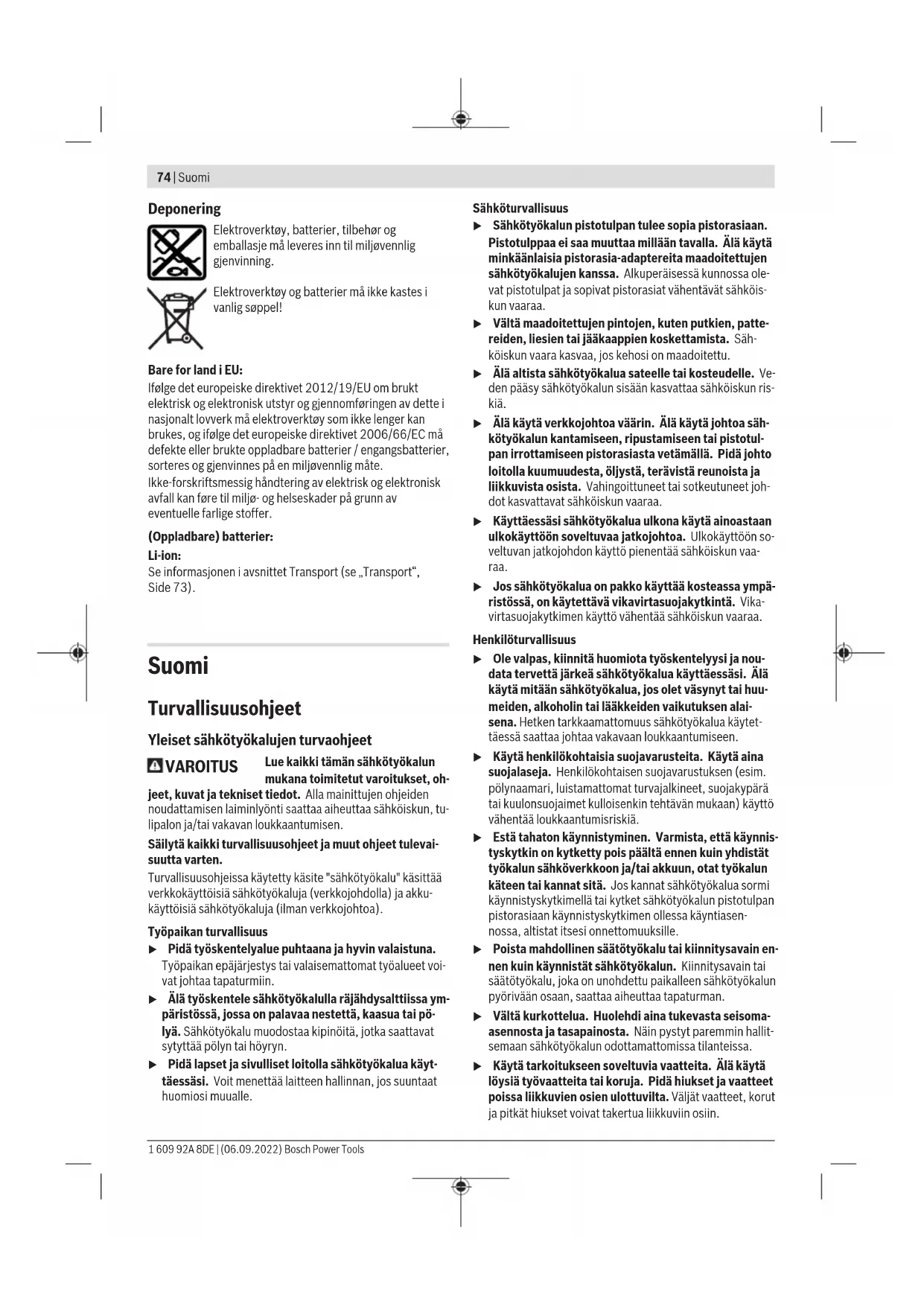 Høyt turtall, til arbeid med liten bordiameter. u Skyv girvelgeren alltid helt til den stopper. Elektroverktøyet kan ta skade hvis det velter. Temperaturavhengig overbelastningsvern Ved forskriftsmessig bruk kan ikke elektroverktøyet overbelastes. Ved for stor belastning eller hvis temperaturen ikke er innenfor tillatt driftstemperaturområde reduseres turtallet. Elektroverktøyet går ikke med fullt turtall igjen før tillatt driftstemperatur er nådd. Helautomatisk spindellås (Auto-Lock) Når på-/av-bryteren (11) ikke trykkes inn, låses borespindelen og dermed også verktøyholderen (1). Det er da mulig å skru inn skruer også når batteriet (7) er utladet eller bruke elektroverktøyet som skrutrekker. Informasjon om bruk u Sett elektroverktøyet bare mot skruen når det er slått av. Innsatsverktøy som dreier seg kan skli. Før innskruing av større, lengre skruer i harde materialer bør du forbore med kjernediameteren til gjengene til ca. 2/3 av skruelengden. Et hjelpeverktøy kan brukes når skrumaskinbits eller en universalbitsholder skal tas ut. Belteklips Med belteklipset (6) kan du f.eks. henge elektroverktøyet i et belte. Du har da begge hender ledig og elektroverktøyet er alltid lett tilgjengelig. Service og vedlikehold Vedlikehold og rengjøring u Ta alltid batteriet ut av elektroverktøyet før arbeider på elektroverktøyet utføres (f.eks. vedlikehold, verktøyskifte osv.) og før transport og oppbevaring. Det er fare for skader hvis du trykker på av/på-bryteren ved en feiltagelse. u Hold selve elektroverktøyet og ventilasjonsslissene alltid rene, for å kunne arbeide bra og sikkert. Kundeservice og kundeveiledning Kundeservice hjelper deg ved spørsmål om reparasjon og vedlikehold av produktet ditt og reservedelene. Du finner også sprengskisser og informasjon om reservedeler på www.bosch-pt.com Boschs kundeveilederteam hjelper deg gjerne hvis du har spørsmål om våre produkter og tilbehør. Ved alle forespørsler og reservedelsbestillinger må du oppgi det 10‑sifrede produktnummeret som er angitt på produktets typeskilt. Norsk Robert Bosch AS Postboks 350 1402 Ski Tel.: 64 87 89 50 Faks: 64 87 89 55 Du finner adresser til andre verksteder på: www.bosch-pt.com/serviceaddresses Transport De anbefalte li-ion-batteriene underligger kravene for farlig gods. Batteriene kan transporteres på veier av brukeren uten ytterligere krav. Ved forsendelse gjennom tredje personer (f.eks.: lufttransport eller spedisjon) må det oppfylles spesielle krav til emballasje og merking. Du må konsultere en ekspert for farlig gods ved forberedelse av forsendelsen. Send batterier kun hvis huset ikke er skadet. Lim igjen de åpne kontaktene og pakk batteriet slik at det ikke beveger seg i emballasjen. Ta også hensyn til videreførende nasjonale forskrifter. Bosch Power Tools 1 609 92A 8DE | (06.09.2022)74 | Suomi Deponering Elektroverktøy, batterier, tilbehør og emballasje må leveres inn til miljøvennlig gjenvinning. Elektroverktøy og batterier må ikke kastes i vanlig søppel! Bare for land i EU: Ifølge det europeiske direktivet 2012/19/EU om brukt elektrisk og elektronisk utstyr og gjennomføringen av dette i nasjonalt lovverk må elektroverktøy som ikke lenger kan brukes, og ifølge det europeiske direktivet 2006/66/EC må defekte eller brukte oppladbare batterier / engangsbatterier, sorteres og gjenvinnes på en miljøvennlig måte. Ikke-forskriftsmessig håndtering av elektrisk og elektronisk avfall kan føre til miljø- og helseskader på grunn av eventuelle farlige stoffer. (Oppladbare) batterier: Li-ion: Se informasjonen i avsnittet Transport (se „Transport“, Side73). Suomi Turvallisuusohjeet Yleiset sähkötyökalujen turvaohjeet VAROITUS Lue kaikki tämän sähkötyökalun mukana toimitetut varoitukset, oh- jeet, kuvat ja tekniset tiedot. Alla mainittujen ohjeiden noudattamisen laiminlyönti saattaa aiheuttaa sähköiskun, tu- lipalon ja/tai vakavan loukkaantumisen. Säilytä kaikki turvallisuusohjeet ja muut ohjeet tulevai- suutta varten. Turvallisuusohjeissa käytetty käsite "sähkötyökalu" käsittää verkkokäyttöisiä sähkötyökaluja (verkkojohdolla) ja akku- käyttöisiä sähkötyökaluja (ilman verkkojohtoa). Työpaikan turvallisuus u Pidä työskentelyalue puhtaana ja hyvin valaistuna. Työpaikan epäjärjestys tai valaisemattomat työalueet voi- vat johtaa tapaturmiin. u Älä työskentele sähkötyökalulla räjähdysalttiissa ym- päristössä, jossa on palavaa nestettä, kaasua tai pö- lyä. Sähkötyökalu muodostaa kipinöitä, jotka saattavat sytyttää pölyn tai höyryn. u Pidä lapset ja sivulliset loitolla sähkötyökalua käyt- täessäsi. Voit menettää laitteen hallinnan, jos suuntaat huomiosi muualle. Sähköturvallisuus u Sähkötyökalun pistotulpan tulee sopia pistorasiaan. Pistotulppaa ei saa muuttaa millään tavalla. Älä käytä minkäänlaisia pistorasia-adaptereita maadoitettujen sähkötyökalujen kanssa. Alkuperäisessä kunnossa ole- vat pistotulpat ja sopivat pistorasiat vähentävät sähköis- kun vaaraa. u Vältä maadoitettujen pintojen, kuten putkien, patte- reiden, liesien tai jääkaappien koskettamista. Säh- köiskun vaara kasvaa, jos kehosi on maadoitettu. u Älä altista sähkötyökalua sateelle tai kosteudelle. Ve- den pääsy sähkötyökalun sisään kasvattaa sähköiskun ris- kiä. u Älä käytä verkkojohtoa väärin. Älä käytä johtoa säh- kötyökalun kantamiseen, ripustamiseen tai pistotul- pan irrottamiseen pistorasiasta vetämällä. Pidä johto loitolla kuumuudesta, öljystä, terävistä reunoista ja liikkuvista osista. Vahingoittuneet tai sotkeutuneet joh- dot kasvattavat sähköiskun vaaraa. u Käyttäessäsi sähkötyökalua ulkona käytä ainoastaan ulkokäyttöön soveltuvaa jatkojohtoa. Ulkokäyttöön so- veltuvan jatkojohdon käyttö pienentää sähköiskun vaa- raa. u Jos sähkötyökalua on pakko käyttää kosteassa ympä- ristössä, on käytettävä vikavirtasuojaky