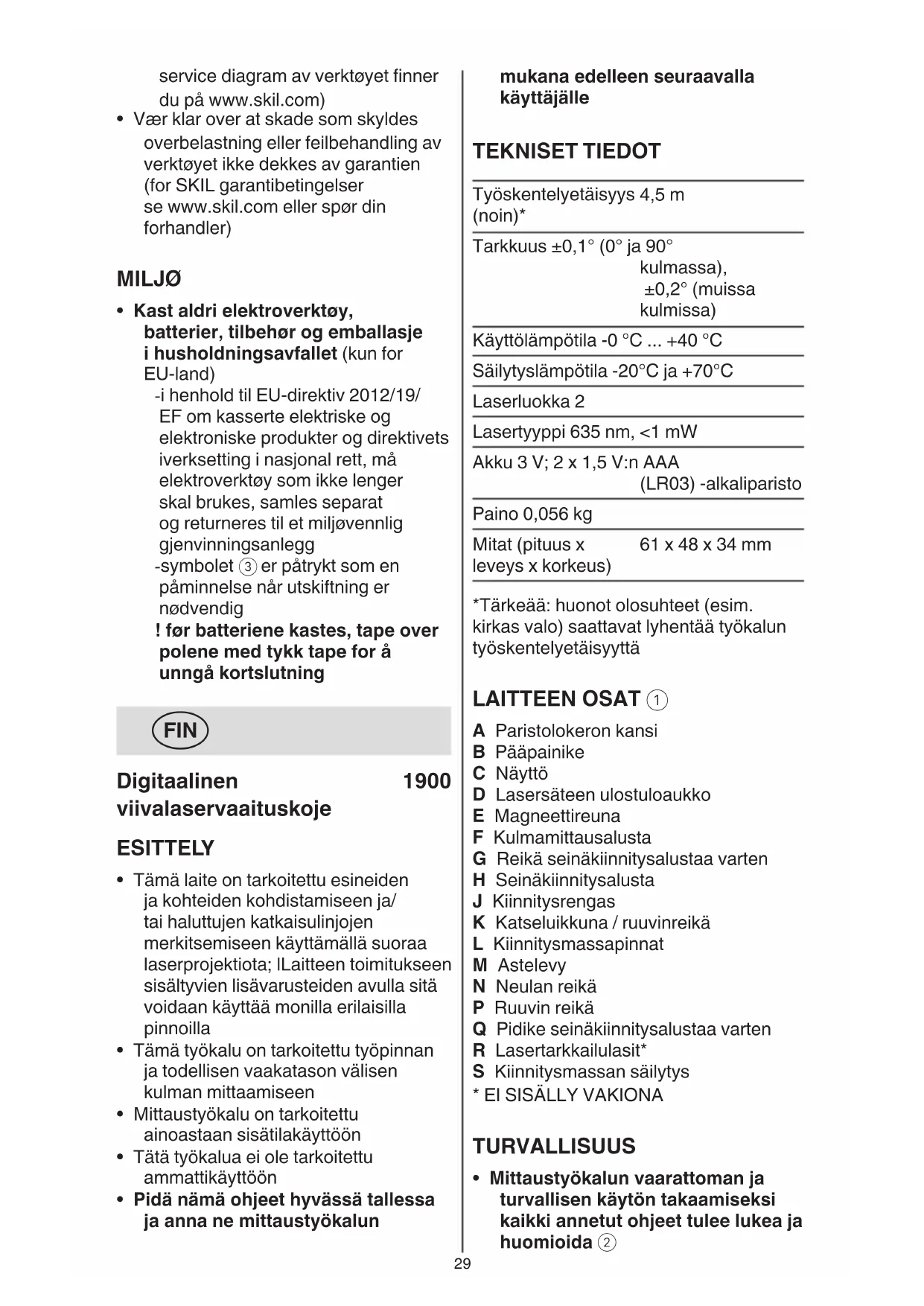 - Ota huomioon, että takuu ei kata työkalun ylikuormituksesta tai väärästä käsittelystä johtuvia vahinkoja (katso SKILin takuuehdot osoitteesta www.skil.com tai kysy jälleenmyyjältä)