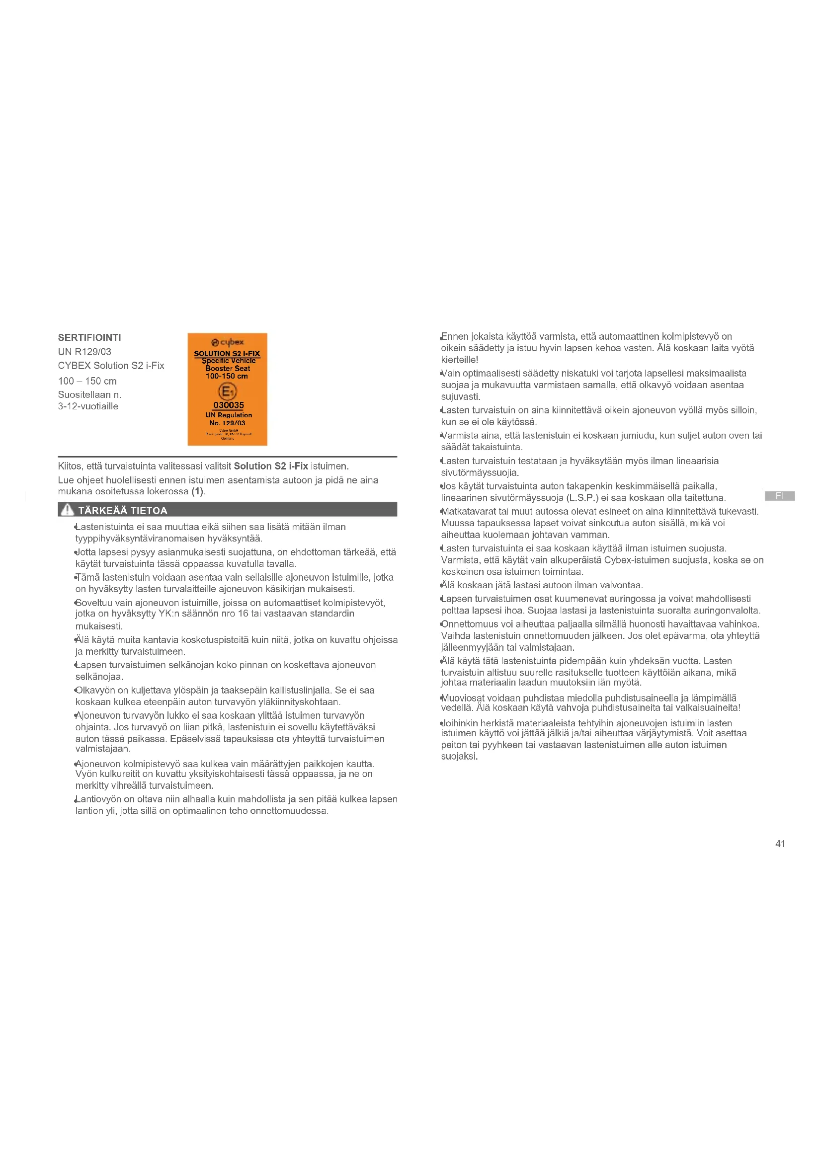Kiitos, että turvaistuinta valitessasi valitsit Solution S2 i-Fix istuimen. Lue ohjeet huolellisesti ennen istuimen asentamista autoon ja pidä ne aina mukana osoitetussa lokerossa (1).