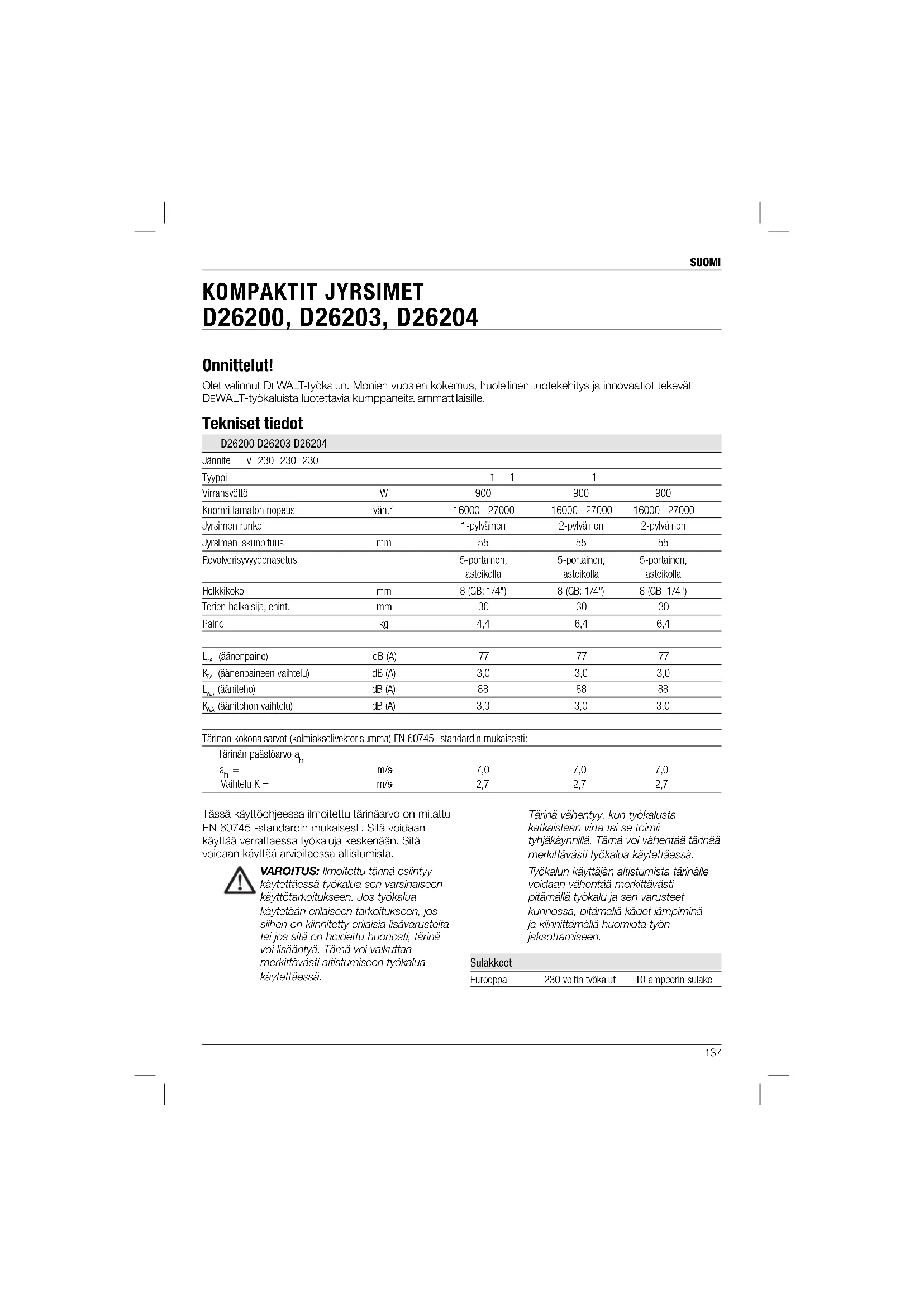 KOMPAKTIT JYRSIMET D26200, D26203, D26204 Onnittelut! Olet valinnut DEWALT-työkalun. Monien vuosien kokemus, huolellinen tuotekehitys ja innovaatiot tekevät DEWALT-työkaluista luotettavia kumppaneita ammattilaisille. Tekniset tiedot D26200 D26203 D26204 Jännite V 230 230 230 Tyyppi 1 1 1 Virransyöttö W 900 900 900 Kuormittamaton nopeus väh.