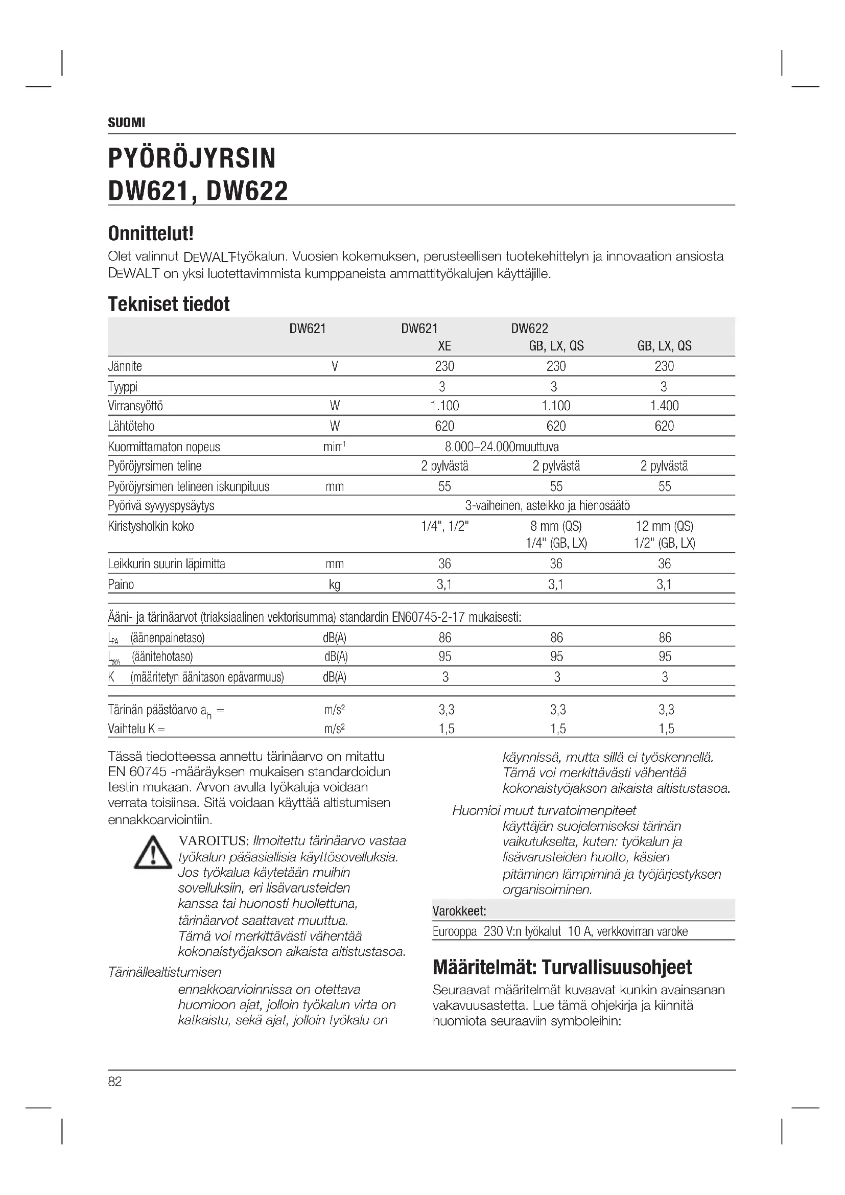 DW621, DW622 Suomi (käännetty alkuperäisestä käyttöohjeesta)83 suomi Yleiset sähkölaitteita koskevat turvavaroitukset VAROITUS! Lue kaikki turvallisuusvaroitukset ja -ohjeet. Varoitusten ja ohjeiden noudattamatta jättäminen saattaa aiheuttaa sähköiskun, tulipalon ja/tai vakavan vamman.