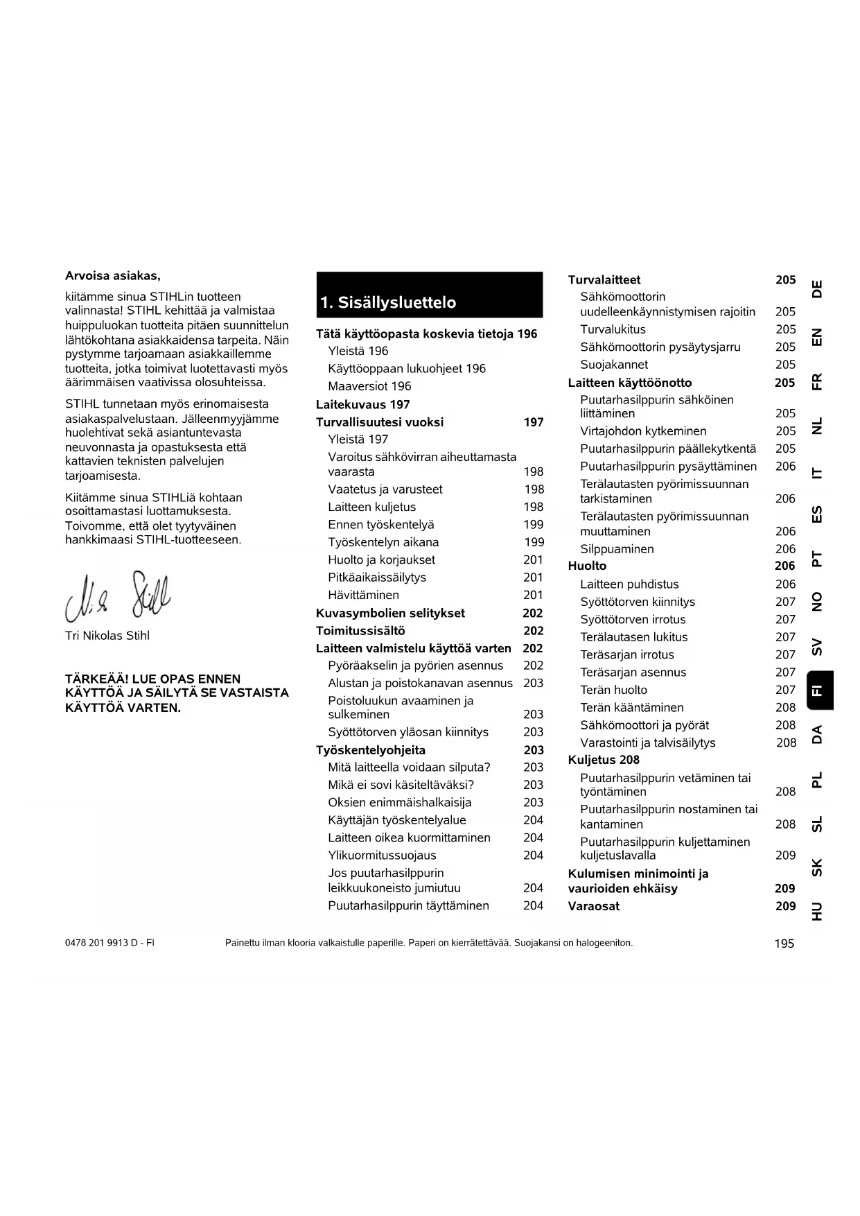 Service utförd den Datum för nästa service195 DEENFRNLITESPTNOSVDAPLSLSKHU FI 0478 201 9913 D - FI Arvoisa asiakas, kiitämme sinua STIHLin tuotteen valinnasta! STIHL kehittää ja valmistaa huippuluokan tuotteita pitäen suunnittelun lähtökohtana asiakkaidensa tarpeita. Näin pystymme tarjoamaan asiakkaillemme tuotteita, jotka toimivat luotettavasti myös äärimmäisen vaativissa olosuhteissa. STIHL tunnetaan myös erinomaisesta asiakaspalvelustaan. Jälleenmyyjämme huolehtivat sekä asiantuntevasta neuvonnasta ja opastuksesta että kattavien teknisten palvelujen tarjoamisesta. Kiitämme sinua STIHLiä kohtaan osoittamastasi luottamuksesta. Toivomme, että olet tyytyväinen hankkimaasi STIHL-tuotteeseen. Tri Nikolas Stihl