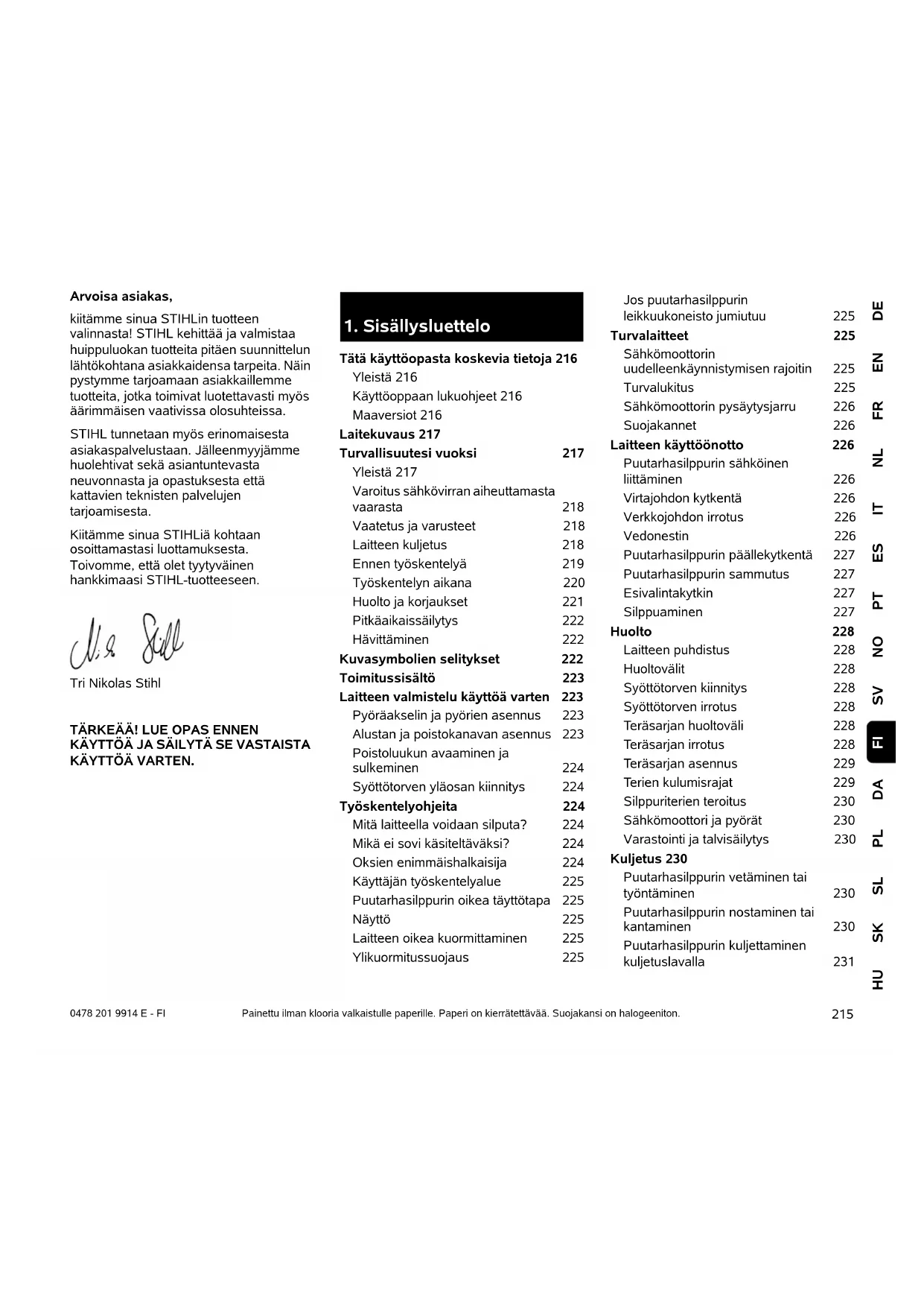 DEENFRNLITESPTNOSVDAPLSLSKHU FI 0478 201 9914 E - FI Arvoisa asiakas, kiitämme sinua STIHLin tuotteen valinnasta! STIHL kehittää ja valmistaa huippuluokan tuotteita pitäen suunnittelun lähtökohtana asiakkaidensa tarpeita. Näin pystymme tarjoamaan asiakkaillemme tuotteita, jotka toimivat luotettavasti myös äärimmäisen vaativissa olosuhteissa. STIHL tunnetaan myös erinomaisesta asiakaspalvelustaan. Jälleenmyyjämme huolehtivat sekä asiantuntevasta neuvonnasta ja opastuksesta että kattavien teknisten palvelujen tarjoamisesta. Kiitämme sinua STIHLiä kohtaan osoittamastasi luottamuksesta. Toivomme, että olet tyytyväinen hankkimaasi STIHL-tuotteeseen. Tri Nikolas Stihl
