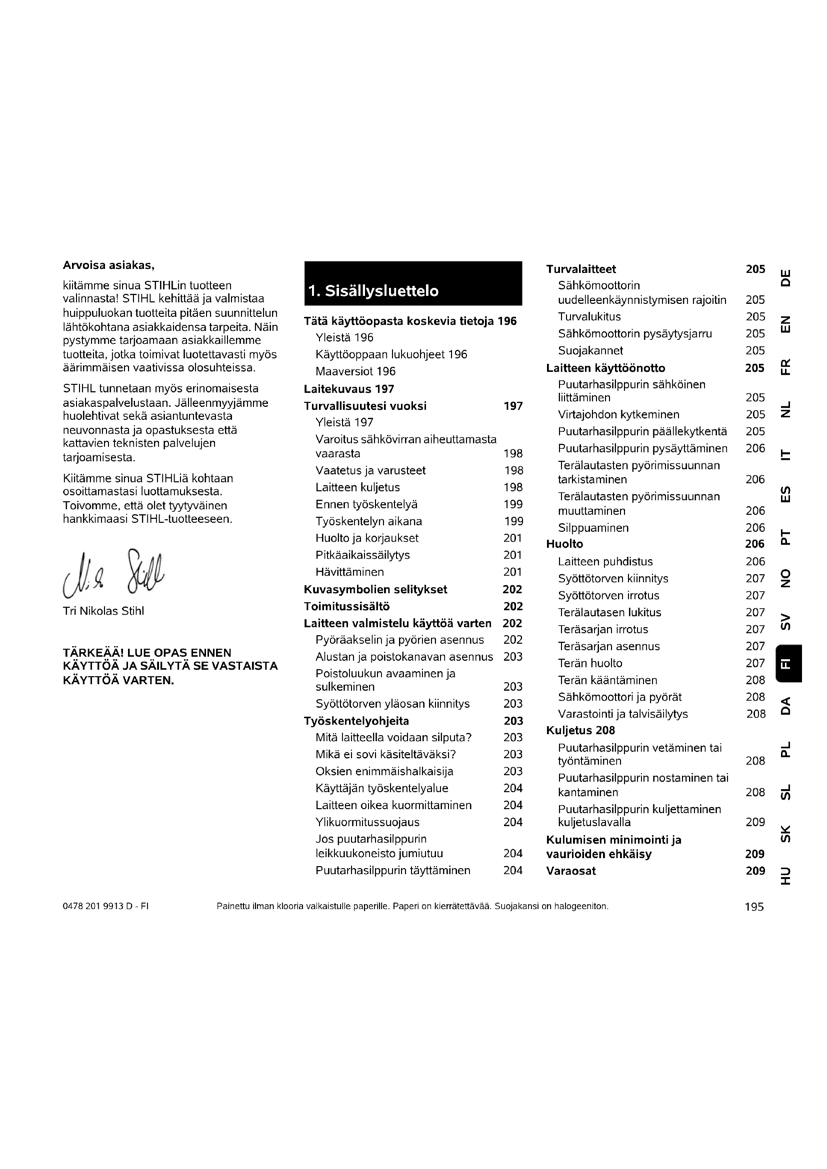 Service utförd den Datum för nästa service195 DEENFRNLITESPTNOSVDAPLSLSKHU FI 0478 201 9913 D - FI Arvoisa asiakas, kiitämme sinua STIHLin tuotteen valinnasta! STIHL kehittää ja valmistaa huippuluokan tuotteita pitäen suunnittelun lähtökohtana asiakkaidensa tarpeita. Näin pystymme tarjoamaan asiakkaillemme tuotteita, jotka toimivat luotettavasti myös äärimmäisen vaativissa olosuhteissa. STIHL tunnetaan myös erinomaisesta asiakaspalvelustaan. Jälleenmyyjämme huolehtivat sekä asiantuntevasta neuvonnasta ja opastuksesta että kattavien teknisten palvelujen tarjoamisesta. Kiitämme sinua STIHLiä kohtaan osoittamastasi luottamuksesta. Toivomme, että olet tyytyväinen hankkimaasi STIHL-tuotteeseen. Tri Nikolas Stihl