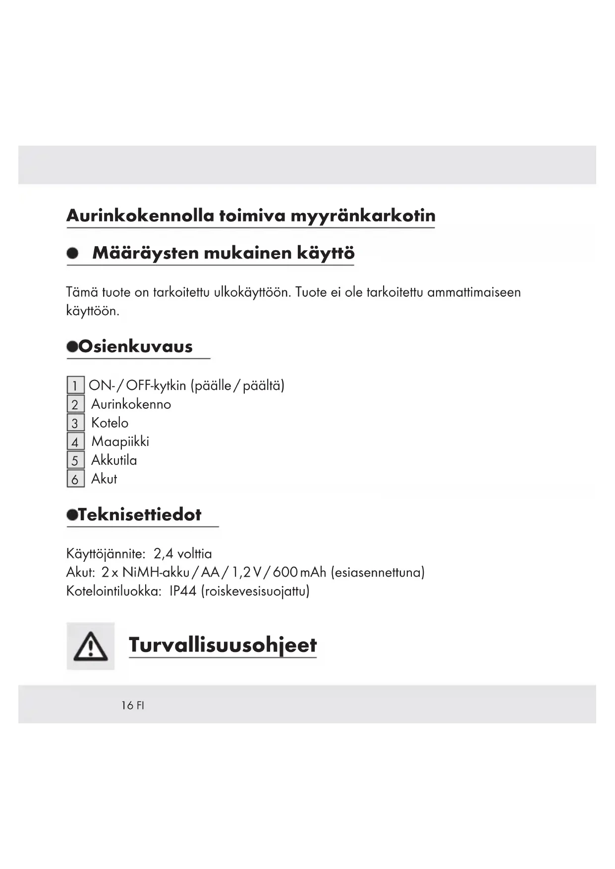 Akut Tekniset tiedot Käyttöjännite: 2,4 volttia Akut: 2 x NiMH-akku / AA / 1,2 V / 600 mAh (esiasennettuna) Kotelointiluokka: IP44 (roiskevesisuojattu) Turvallisuusohjeet17 FI VAARALLINEN LAPSILLE,