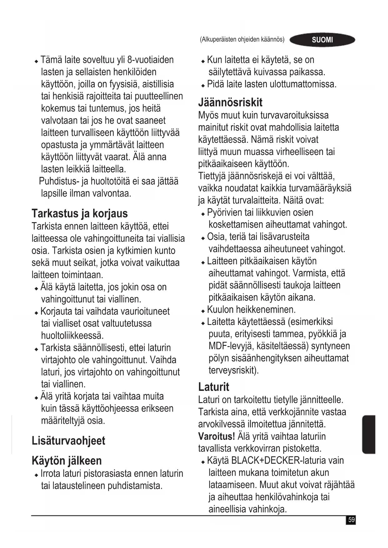 Varoitus! Lue kaikki turvallisuusvaroitukset ja ohjeet. Alla olevien varoitusten ja ohjeiden noudattamisen laiminlyönti saattaa johtaa sähköiskuun, tulipaloon ja/tai vakavaan loukkaantumiseen. u Käyttötarkoitus kuvataan näissä ohjeissa. Muiden kuin ohjeissa suositeltujen lisävarusteiden tai -osien käyttö sekä laitteen käyttö muuhun kuin oppaassa suositeltuun tarkoitukseen voi aiheuttaa henkilövahingon vaaran. u Säilytä tämä käyttöohje tulevaa tarvetta varten. Laitteen käyttö u Älä käytä laitetta nesteiden tai syttyvien materiaalien keräämiseen. u Älä käytä laitetta veden lähellä.u Älä upota laitetta veteen.u Älä koskaan irrota laturia pistorasiasta vetämällä virtajohdosta. Pidä laturin virtajohto etäällä lämmönlähteistä, öljystä ja terävistä reunoista.59 (Alkuperäisten ohjeiden käännös) SUOMI u Tämä laite soveltuu yli 8-vuotiaiden lasten ja sellaisten henkilöiden käyttöön, joilla on fyysisiä, aistillisia tai henkisiä rajoitteita tai puutteellinen kokemus tai tuntemus, jos heitä valvotaan tai jos he ovat saaneet laitteen turvalliseen käyttöön liittyvää opastusta ja ymmärtävät laitteen käyttöön liittyvät vaarat. Älä anna lasten leikkiä laitteella. Puhdistus- ja huoltotöitä ei saa jättää lapsille ilman valvontaa. Tarkastus ja korjaus Tarkista ennen laitteen käyttöä, ettei laitteessa ole vahingoittuneita tai viallisia osia. Tarkista osien ja kytkimien kunto sekä muut seikat, jotka voivat vaikuttaa laitteen toimintaan. u Älä käytä laitetta, jos jokin osa on vahingoittunut tai viallinen. u Korjauta tai vaihdata vaurioituneet tai vialliset osat valtuutetussa huoltoliikkeessä. u Tarkista säännöllisesti, ettei laturin virtajohto ole vahingoittunut. Vaihda laturi, jos virtajohto on vahingoittunut tai viallinen. u Älä yritä korjata tai vaihtaa muita kuin tässä käyttöohjeessa erikseen määriteltyjä osia. Lisäturvaohjeet Käytön jälkeen u Irrota laturi pistorasiasta ennen laturin tai lataustelineen puhdistamista. u Kun laitetta ei käytetä, se on säilytettävä kuivassa paikassa. u Pidä laite lasten ulottumattomissa. Jäännösriskit Myös muut kuin turvavaroituksissa mainitut riskit ovat mahdollisia laitetta käytettäessä. Nämä riskit voivat liittyä muun muassa virheelliseen tai pitkäaikaiseen käyttöön. Tiettyjä jäännösriskejä ei voi välttää, vaikka noudatat kaikkia turvamääräyksiä ja käytät turvalaitteita. Näitä ovat: u Pyörivien tai liikkuvien osien koskettamisen aiheuttamat vahingot. u Osia, teriä tai lisävarusteita vaihdettaessa aiheutuneet vahingot. u Laitteen pitkäaikaisen käytön aiheuttamat vahingot. Varmista, että pidät säännöllisesti taukoja laitteen pitkäaikaisen käytön aikana. u Kuulon heikkeneminen.u Laitetta käytettäessä (esimerkiksi puuta, erityisesti tammea, pyökkiä ja MDF-levyjä, käsiteltäessä) syntyneen pölyn sisäänhengityksen aiheuttamat terveysriskit). Laturit Laturi on tarkoitettu tietylle jännitteelle. Tarkista aina, että verkkojännite vastaa arvokilvessä ilmoitettua jännitettä. Varoitus! Älä yritä vaihtaa laturiin tavallista verkkovirran pistoketta. u Käytä BLACK+DECKER-laturia vain laitteen mukana toimitetun akun lataamiseen. Muut akut voivat räjähtää ja aiheuttaa henkilövahinkoja tai aineellisia vahinkoja.60 (Alkuperäisten ohjeiden käännös)SUOMIu Älä koskaan yritä ladata akkuja, joita ei ole tarkoitettu ladattaviksi. u Jos virtajohto vahingoittuu, sen vaihtaminen on turvallisuussyistä jätettävä valmistajan tai valtuutetun BLACK+DECKER-huollon tehtäväksi. u Suojaa laturi vedeltä.u Älä avaa laturia.u Älä työnnä mitään laturin sisään.u Lataa laite/akku vain hyvin tuuletetussa paikassa. Sähköturvallisuus Laturin symbolit
