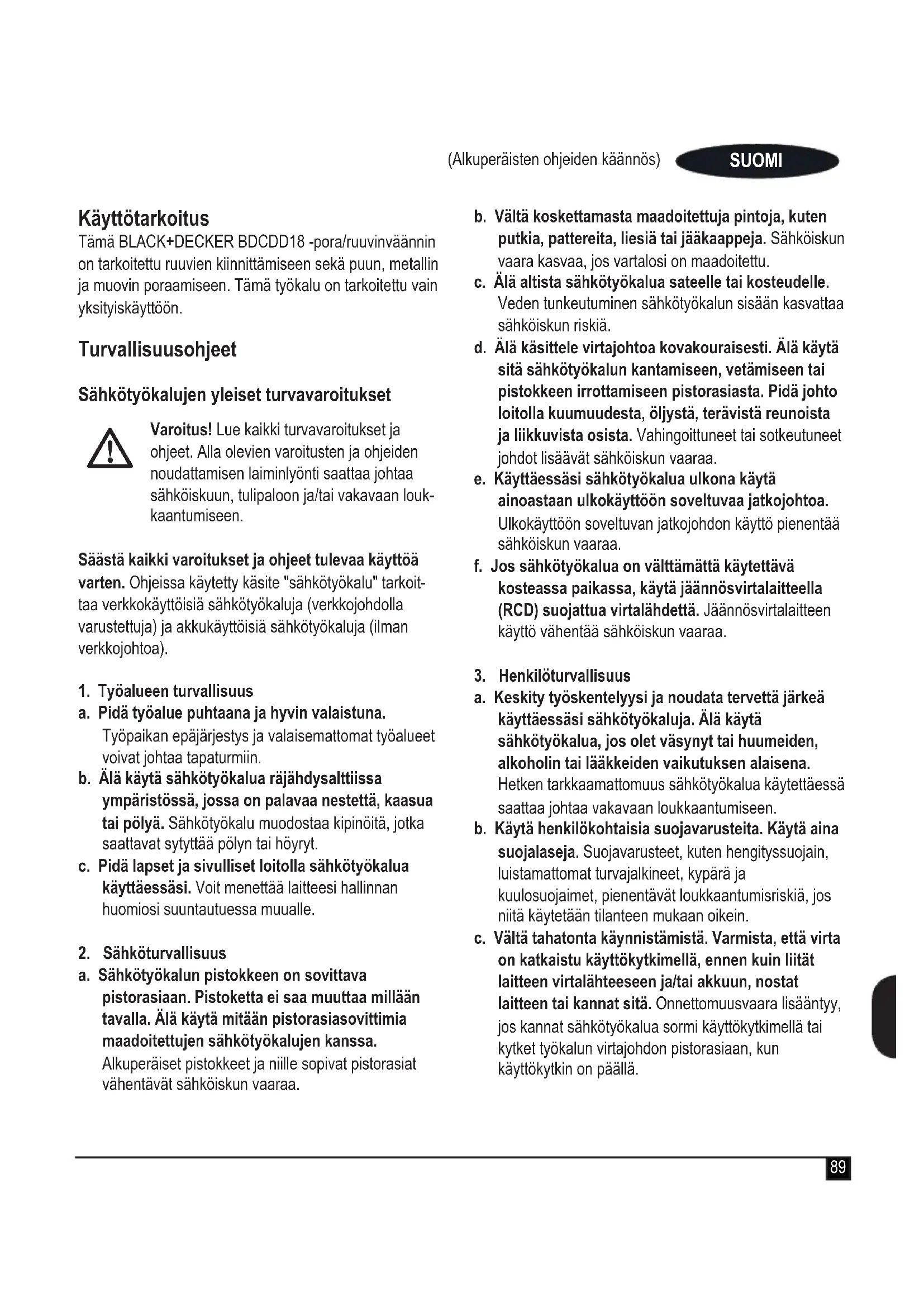 (Alkuperäisten ohjeiden käännös) SUOMI Käyttötarkoitus Tämä BLACK+DECKER BDCDD18 -pora/ruuvinväännin on tarkoitettu ruuvien kiinnittämiseen sekä puun, metallin ja muovin poraamiseen. Tämä työkalu on tarkoitettu vain yksityiskäyttöön. Turvallisuusohjeet Sähkötyökalujen yleiset turvavaroitukset