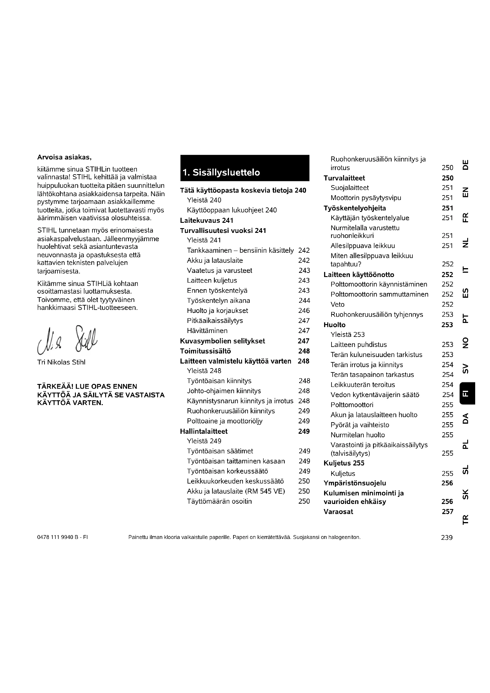 DEENFRNLITESPTNOSVDAPLSLSKTR FI 0478 111 9940 B - FI Arvoisa asiakas, kiitämme sinua STIHLin tuotteen valinnasta! STIHL kehittää ja valmistaa huippuluokan tuotteita pitäen suunnittelun lähtökohtana asiakkaidensa tarpeita. Näin pystymme tarjoamaan asiakkaillemme tuotteita, jotka toimivat luotettavasti myös äärimmäisen vaativissa olosuhteissa. STIHL tunnetaan myös erinomaisesta asiakaspalvelustaan. Jälleenmyyjämme huolehtivat sekä asiantuntevasta neuvonnasta ja opastuksesta että kattavien teknisten palvelujen tarjoamisesta. Kiitämme sinua STIHLiä kohtaan osoittamastasi luottamuksesta. Toivomme, että olet tyytyväinen hankkimaasi STIHL-tuotteeseen. Tri Nikolas Stihl