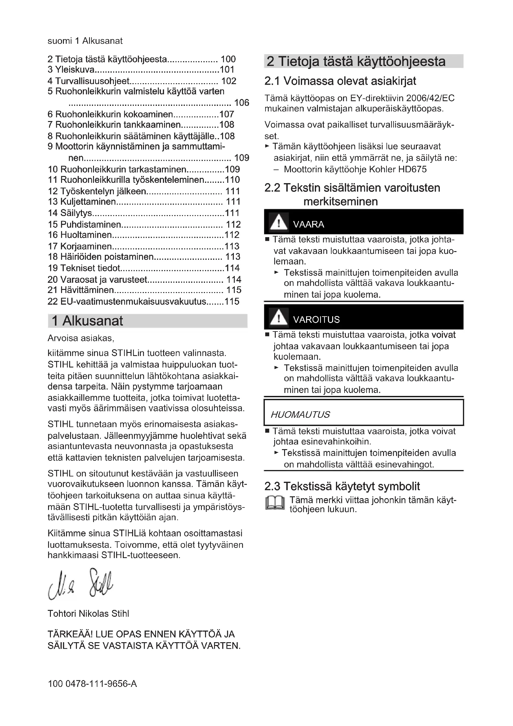 - 22 EU-vaatimustenmukaisuusvakuutus 1 Alkusanat Arvoisa asiakas, kiitämme sinua STIHLin tuotteen valinnasta. STIHL kehittää ja valmistaa huippuluokan tuot‐ teita pitäen suunnittelun lähtökohtana asiakkai‐ densa tarpeita. Näin pystymme tarjoamaan asiakkaillemme tuotteita, jotka toimivat luotetta‐ vasti myös äärimmäisen vaativissa olosuhteissa. STIHL tunnetaan myös erinomaisesta asiakas‐ palvelustaan. Jälleenmyyjämme huolehtivat sekä asiantuntevasta neuvonnasta ja opastuksesta että kattavien teknisten palvelujen tarjoamisesta. STIHL on sitoutunut kestävään ja vastuulliseen vuorovaikutukseen luonnon kanssa. Tämän käyt‐ töohjeen tarkoituksena on auttaa sinua käyttä‐ mään STIHL-tuotetta turvallisesti ja ympäristöys‐ tävällisesti pitkän käyttöiän ajan. Kiitämme sinua STIHLiä kohtaan osoittamastasi luottamuksesta. Toivomme, että olet tyytyväinen hankkimaasi STIHL-tuotteeseen. Tohtori Nikolas Stihl TÄRKEÄÄ! LUE OPAS ENNEN KÄYTTÖÄ JA SÄILYTÄ SE VASTAISTA KÄYTTÖÄ VARTEN. 2 Tietoja tästä käyttöohjeesta p. 115