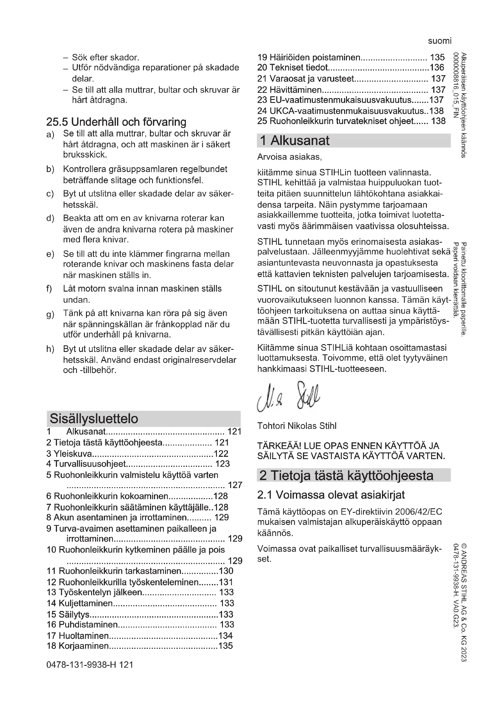 Tämä käyttöopas on EY-direktiivin 2006/42/EC mukaisen valmistajan alkuperäiskäyttö oppaan käännös. Voimassa ovat paikalliset turvallisuusmääräyk‐ set. suomi 0478-131-9938-H 121 © ANDREAS STIHL AG & Co. KG 2023 0478-131-9938-H. VA0.G23. Painettu kloorittomalle paperille. Paperi voidaan kierrättää. Alkuperäisen käyttöohjeen käännös 0000008816_015_FIN► Tämän käyttöohjeen lisäksi lue seuraavat asiakirjat, niin että ymmärrät ne, ja säilytä ne: