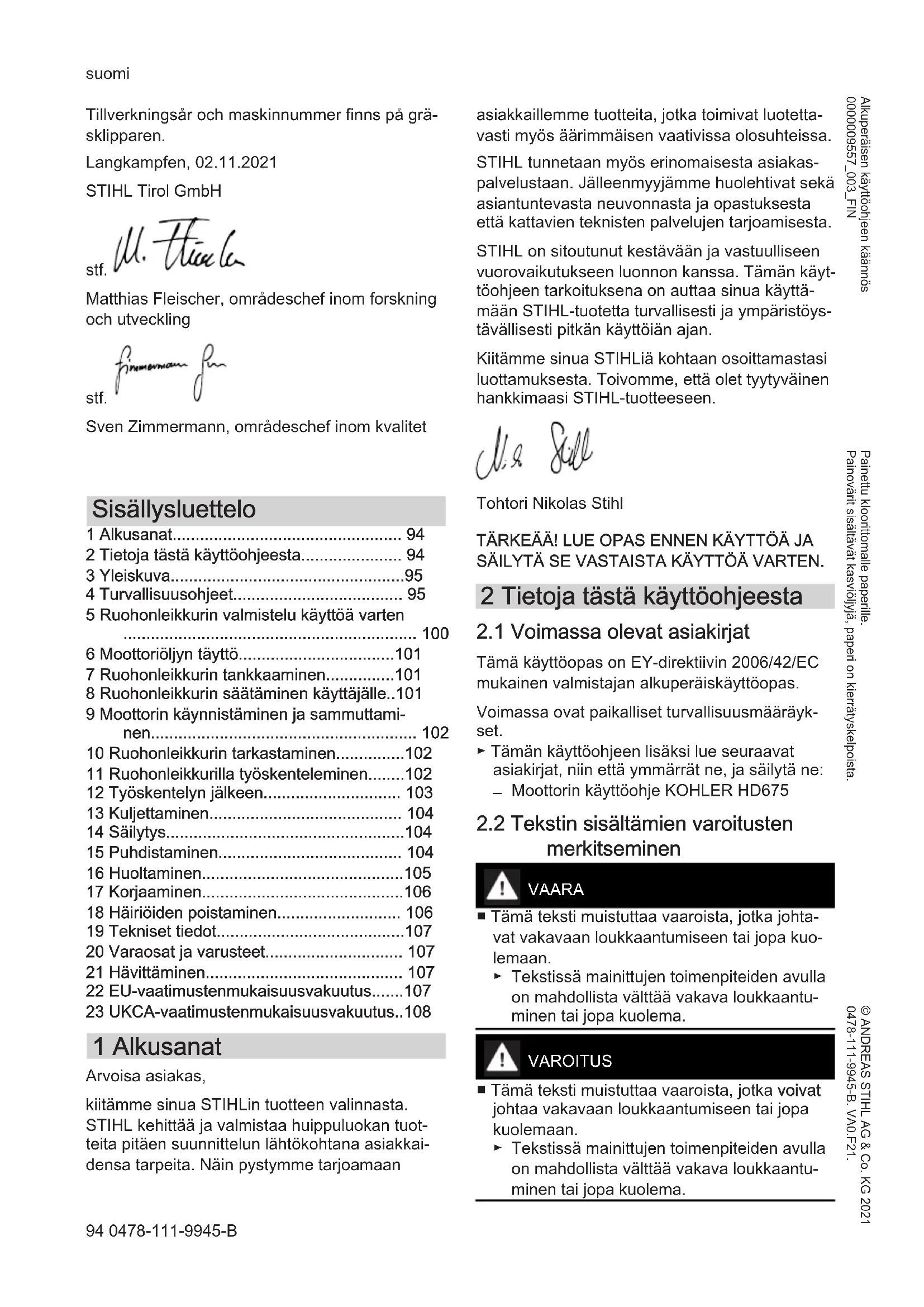 STIHL on sitoutunut kestävään ja vastuulliseen vuorovaikutukseen luonnon kanssa. Tämän käytöohjeen tarkoituksena on auttaa sinua käytä-mään STIHL-tuotetta turvallisesti ja ympäristöys-tavällisesti pitkān käytöian ajan.