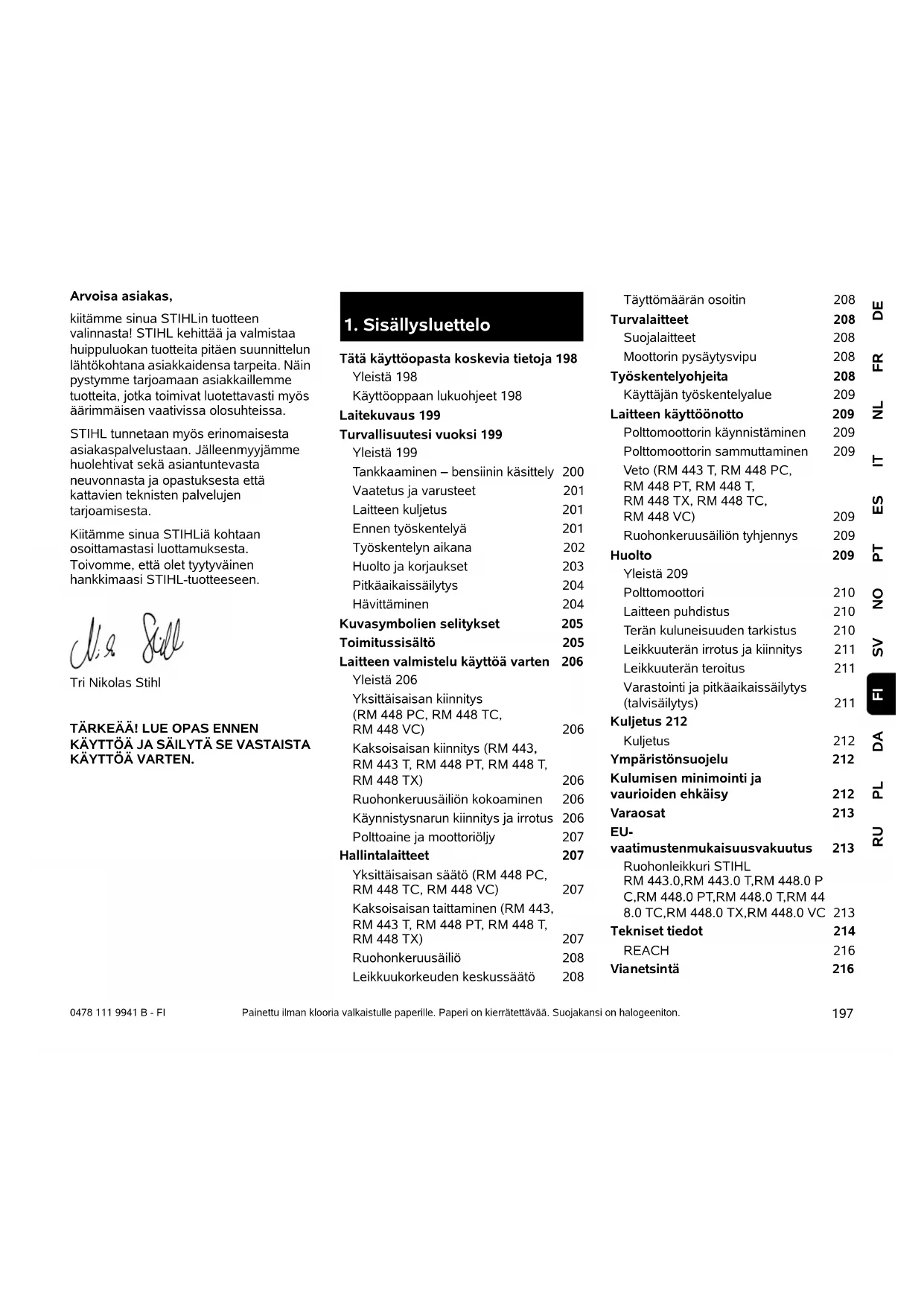 Tätä käyttöopasta koskevia tietoja 198 Yleistä 198 Käyttöoppaan lukuohjeet 198 Laitekuvaus 199 Turvallisuutesi vuoksi 199 Yleistä 199 Tankkaaminen – bensiinin käsittely 200 Vaatetus ja varusteet 201 Laitteen kuljetus 201 Ennen työskentelyä 201 Työskentelyn aikana 202 Huolto ja korjaukset 203 Pitkäaikaissäilytys 204 Hävittäminen 204 Kuvasymbolien selitykset 205 Toimitussisältö 205 Laitteen valmistelu käyttöä varten 206 Yleistä 206 Yksittäisaisan kiinnitys (RM 448 PC, RM 448 TC, RM 448 VC) 206 Kaksoisaisan kiinnitys (RM 443, RM 443 T, RM 448 PT, RM 448 T, RM 448 TX) 206 Ruohonkeruusäiliön kokoaminen 206 Käynnistysnarun kiinnitys ja irrotus 206 Polttoaine ja moottoriöljy 207 Hallintalaitteet 207 Yksittäisaisan säätö (RM 448 PC, RM 448 TC, RM 448 VC) 207 Kaksoisaisan taittaminen (RM 443, RM 443 T, RM 448 PT, RM 448 T, RM 448 TX) 207 Ruohonkeruusäiliö 208 Leikkuukorkeuden keskussäätö 208 Täyttömäärän osoitin 208 Turvalaitteet 208 Suojalaitteet 208 Moottorin pysäytysvipu 208 Työskentelyohjeita 208 Käyttäjän työskentelyalue 209 Laitteen käyttöönotto 209 Polttomoottorin käynnistäminen 209 Polttomoottorin sammuttaminen 209 Veto (RM 443 T, RM 448 PC, RM 448 PT, RM 448 T, RM 448 TX, RM 448 TC, RM 448 VC) 209 Ruohonkeruusäiliön tyhjennys 209 Huolto 209 Yleistä 209 Polttomoottori 210 Laitteen puhdistus 210 Terän kuluneisuuden tarkistus 210 Leikkuuterän irrotus ja kiinnitys 211 Leikkuuterän teroitus 211 Varastointi ja pitkäaikaissäilytys (talvisäilytys) 211 Kuljetus 212 Kuljetus 212 Ympäristönsuojelu 212 Kulumisen minimointi ja vaurioiden ehkäisy 212 Varaosat 213 EU- vaatimustenmukaisuusvakuutus 213 Ruohonleikkuri STIHL RM 443.0,RM 443.0 T,RM 448.0 P C,RM 448.0 PT,RM 448.0 T,RM 44