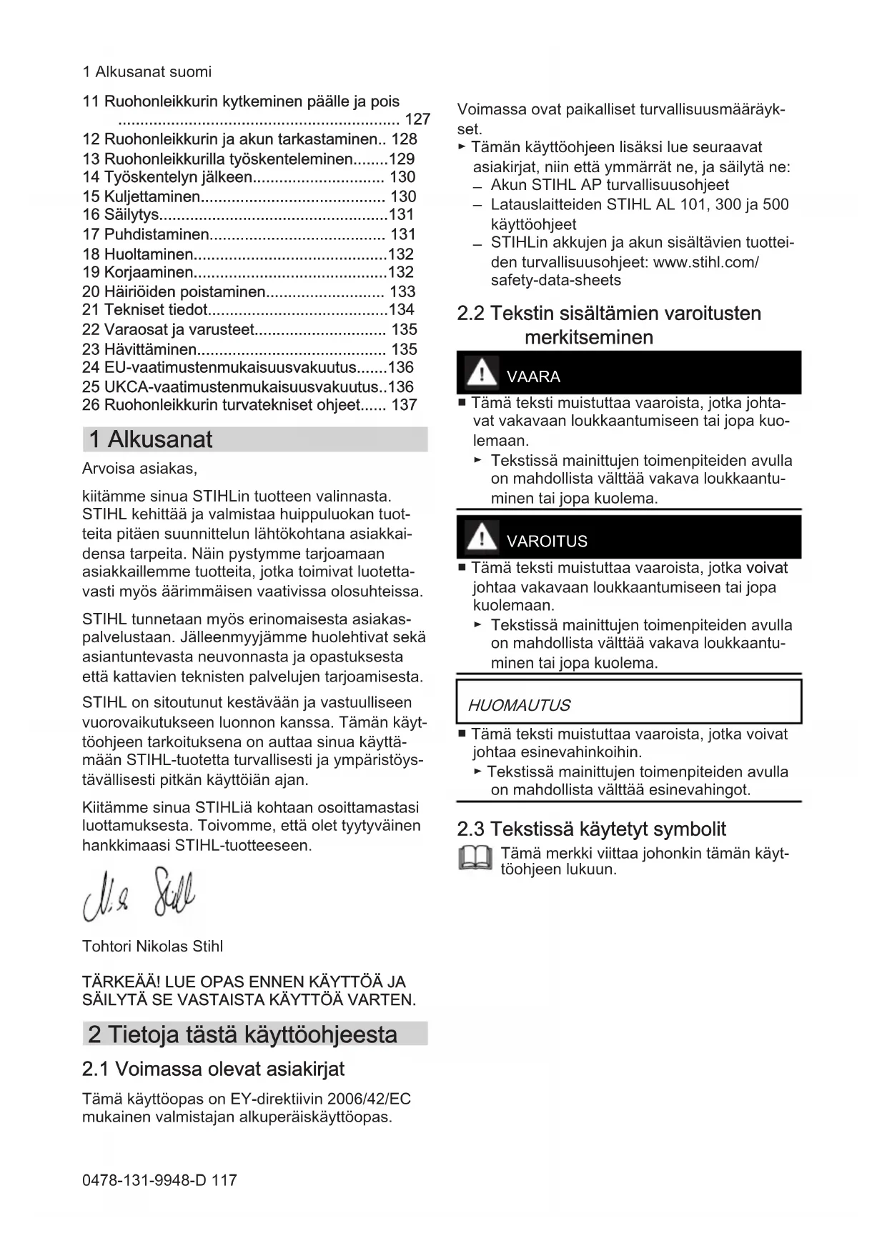 - 26 Ruohonleikkurin turvatekniset ohjeet 1 Alkusanat Arvoisa asiakas, kiitämme sinua STIHLin tuotteen valinnasta. STIHL kehittää ja valmistaa huippuluokan tuot‐ teita pitäen suunnittelun lähtökohtana asiakkai‐ densa tarpeita. Näin pystymme tarjoamaan asiakkaillemme tuotteita, jotka toimivat luotetta‐ vasti myös äärimmäisen vaativissa olosuhteissa. STIHL tunnetaan myös erinomaisesta asiakas‐ palvelustaan. Jälleenmyyjämme huolehtivat sekä asiantuntevasta neuvonnasta ja opastuksesta että kattavien teknisten palvelujen tarjoamisesta. STIHL on sitoutunut kestävään ja vastuulliseen vuorovaikutukseen luonnon kanssa. Tämän käyt‐ töohjeen tarkoituksena on auttaa sinua käyttä‐ mään STIHL-tuotetta turvallisesti ja ympäristöys‐ tävällisesti pitkän käyttöiän ajan. Kiitämme sinua STIHLiä kohtaan osoittamastasi luottamuksesta. Toivomme, että olet tyytyväinen hankkimaasi STIHL-tuotteeseen. Tohtori Nikolas Stihl TÄRKEÄÄ! LUE OPAS ENNEN KÄYTTÖÄ JA SÄILYTÄ SE VASTAISTA KÄYTTÖÄ VARTEN. 2 Tietoja tästä käyttöohjeesta p. 137