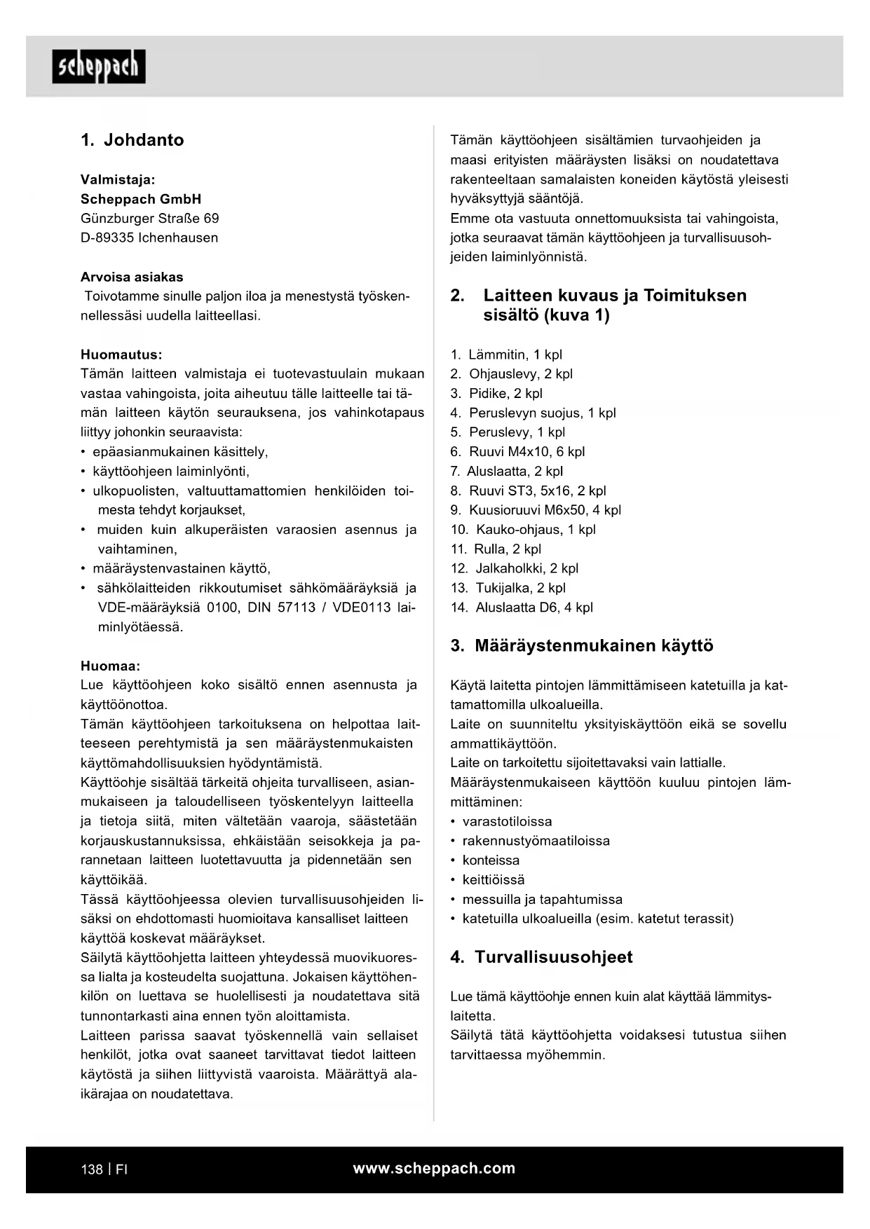 Valmistaja: Scheppach GmbH Günzburger Straße 69 D-89335 Ichenhausen Arvoisa asiakas Toivotamme sinulle paljon iloa ja menestystä työsken- nellessäsi uudella laitteellasi. Huomautus: Tämän laitteen valmistaja ei tuotevastuulain mukaan vastaa vahingoista, joita aiheutuu tälle laitteelle tai tä- män laitteen käytön seurauksena, jos vahinkotapaus liittyy johonkin seuraavista: