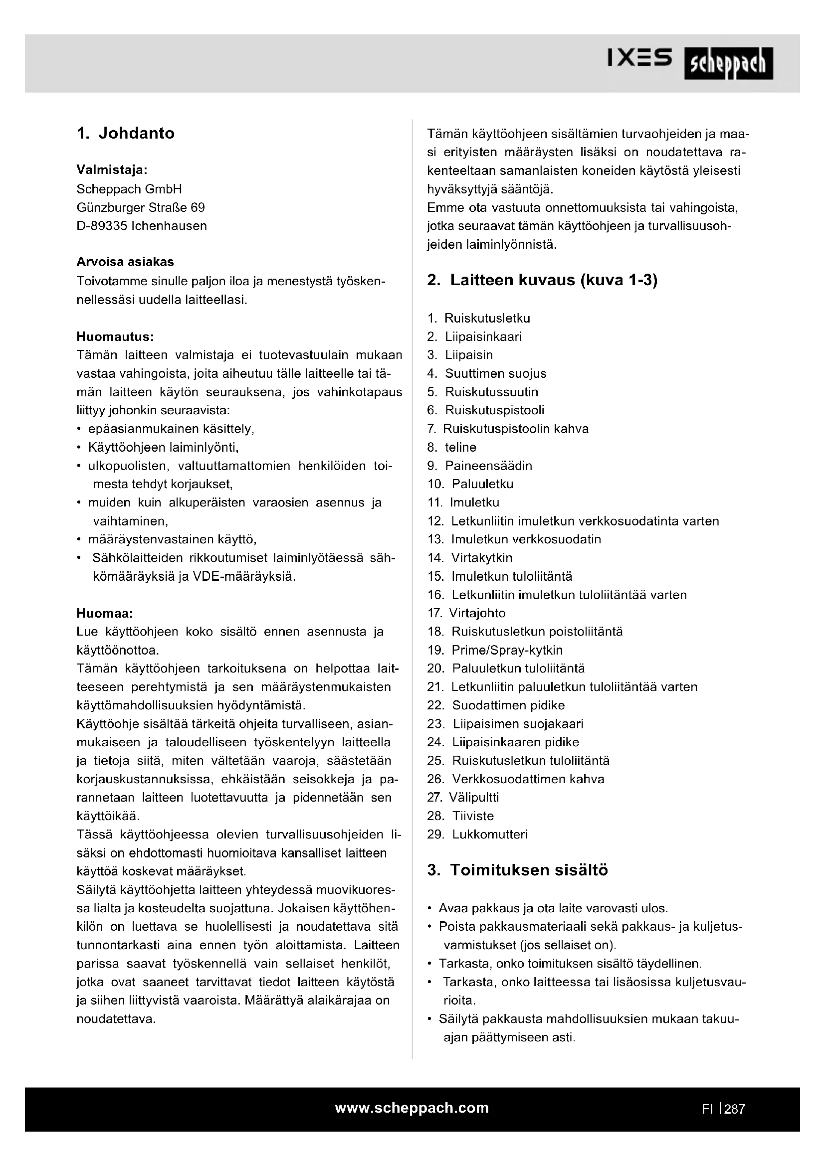 Valmistaja: Scheppach GmbH Günzburger Straße 69 D-89335 Ichenhausen Arvoisa asiakas Toivotamme sinulle paljon iloa ja menestystä työsken- nellessäsi uudella laitteellasi. Huomautus: Tämän laitteen valmistaja ei tuotevastuulain mukaan vastaa vahingoista, joita aiheutuu tälle laitteelle tai tä- män laitteen käytön seurauksena, jos vahinkotapaus liittyy johonkin seuraavista:
