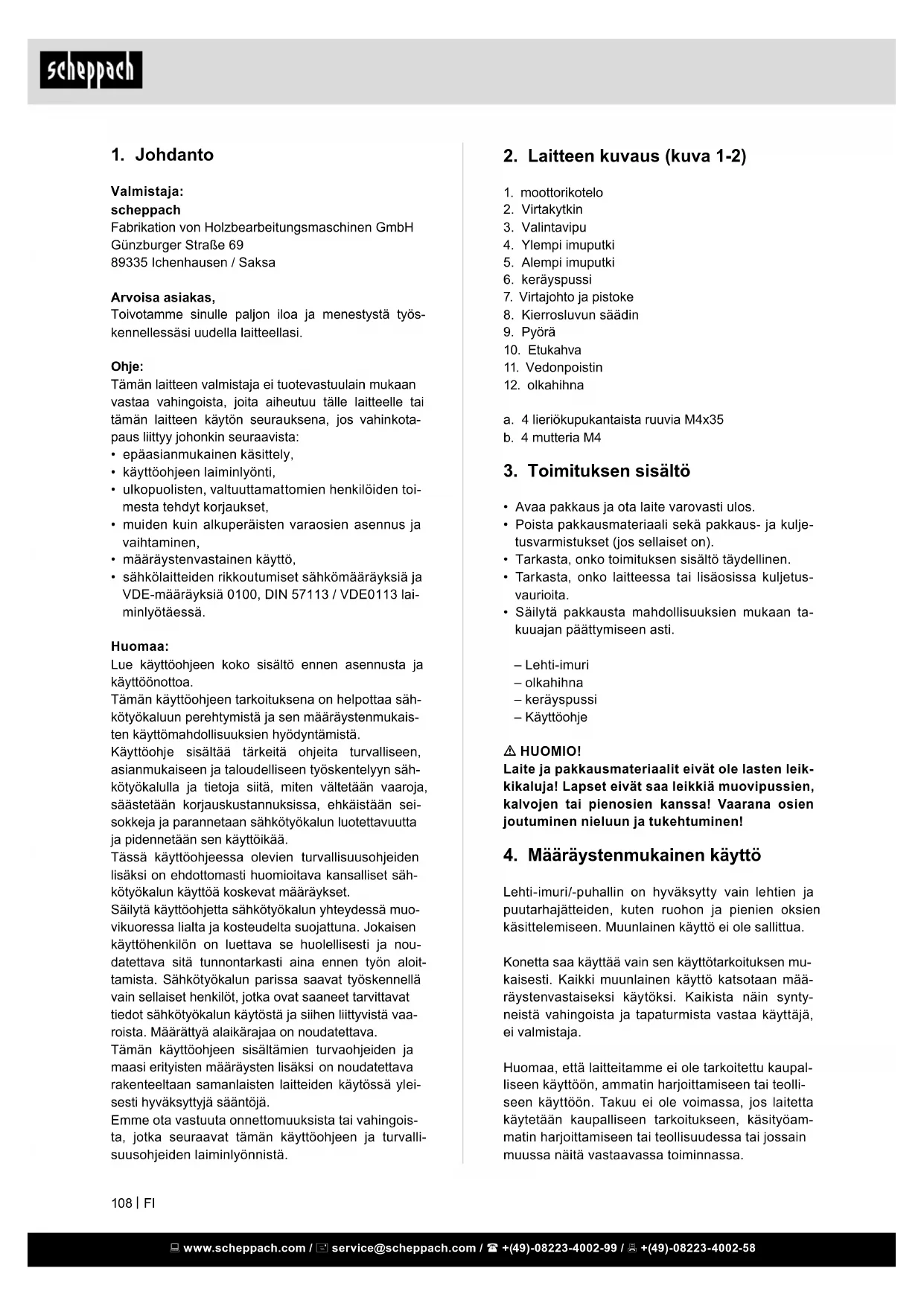 - sähkölaitteiden rikkoutumiset sähkömääräyksiä ja VDE-määräyksiä 0100, DIN 57113 / VDE0113 lai- minlyötäessä. Huomaa: Lue käyttöohjeen koko sisältö ennen asennusta ja käyttöönottoa. Tämän käyttöohjeen tarkoituksena on helpottaa säh- kötyökaluun perehtymistä ja sen määräystenmukais- ten käyttömahdollisuuksien hyödyntämistä. Käyttöohje sisältää tärkeitä ohjeita turvalliseen, asianmukaiseen ja taloudelliseen työskentelyyn säh- kötyökalulla ja tietoja siitä, miten vältetään vaaroja, säästetään korjauskustannuksissa, ehkäistään sei- sokkeja ja parannetaan sähkötyökalun luotettavuutta ja pidennetään sen käyttöikää. Tässä käyttöohjeessa olevien turvallisuusohjeiden lisäksi on ehdottomasti huomioitava kansalliset säh- kötyökalun käyttöä koskevat määräykset. Säilytä käyttöohjetta sähkötyökalun yhteydessä muo- vikuoressa lialta ja kosteudelta suojattuna. Jokaisen käyttöhenkilön on luettava se huolellisesti ja nou- datettava sitä tunnontarkasti aina ennen työn aloit- tamista. Sähkötyökalun parissa saavat työskennellä vain sellaiset henkilöt, jotka ovat saaneet tarvittavat tiedot sähkötyökalun käytöstä ja siihen liittyvistä vaa- roista. Määrättyä alaikärajaa on noudatettava. Tämän käyttöohjeen sisältämien turvaohjeiden ja maasi erityisten määräysten lisäksi on noudatettava rakenteeltaan samanlaisten laitteiden käytössä ylei- sesti hyväksyttyjä sääntöjä. Emme ota vastuuta onnettomuuksista tai vahingois- ta, jotka seuraavat tämän käyttöohjeen ja turvalli- suusohjeiden laiminlyönnistä. www.scheppach.com / service@scheppach.com / +(49)-08223-4002-99 / +(49)-08223-4002-58