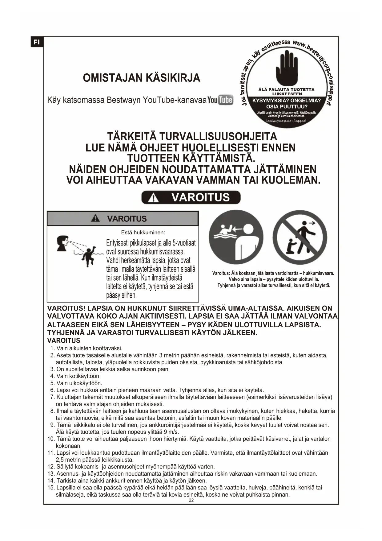 TUOTTEEN KÄYTTÄMISTÄ. NÄIDEN OHJEIDEN NOUDATTAMATTA JÄTTÄMINEN VOI AIHEUTTAA VAKAVAN VAMMAN TAI KUOLEMAN. VAROITUS Varoitus: Älä koskaan jätä lasta vartioimatta – hukkumisvaara.Valvo aina lapsia – pysyttele käden ulottuvilla.Tyhjennä ja varastoi allas turvallisesti, kun sitä ei käytetä.Estä hukkuminen: VAROITUS Erityisesti pikkulapset ja alle 5-vuotiaat ovat suuressa hukkumisvaarassa. Vahdi herkeämättä lapsia, jotka ovat tämä ilmalla täytettävän laitteen sisällä tai sen lähellä. Kun ilmatäytteistä laitetta ei käytetä, tyhjennä se tai estä pääsy siihen. VAROITUS! LAPSIA ON HUKKUNUT SIIRRETTÄVISSÄ UIMA-ALTAISSA. AIKUISEN ON VALVOTTAVA KOKO AJAN AKTIIVISESTI. LAPSIA EI SAA JÄTTÄÄ ILMAN VALVONTAA ALTAASEEN EIKÄ SEN LÄHEISYYTEEN – PYSY KÄDEN ULOTTUVILLA LAPSISTA. TYHJENNÄ JA VARASTOI TURVALLISESTI KÄYTÖN JÄLKEEN. VAROITUS 1. Vain aikuisten koottavaksi. 2. Aseta tuote tasaiselle alustalle vähintään 3 metrin päähän esineistä, rakennelmista tai esteistä, kuten aidasta, autotallista, talosta, yläpuolella roikkuvista puiden oksista, pyykkinaruista tai sähköjohdoista. 3. On suositeltavaa leikkiä selkä aurinkoon päin. 4. Vain kotikäyttöön. 5. Vain ulkokäyttöön. 6. Lapsi voi hukkua erittäin pieneen määrään vettä. Tyhjennä allas, kun sitä ei käytetä. 7. Kuluttajan tekemät muutokset alkuperäiseen ilmalla täytettävään laitteeseen (esimerkiksi lisävarusteiden lisäys) on tehtävä valmistajan ohjeiden mukaisesti. 8. Ilmalla täytettävän laitteen ja kahluualtaan asennusalustan on oltava imukykyinen, kuten hiekkaa, haketta, kumia tai vaahtomuovia, eikä niitä saa asentaa betonin, asfaltin tai muun kovan materiaalin päälle. 9. Tämä leikkikalu ei ole turvallinen, jos ankkurointijärjestelmää ei käytetä, koska kevyet tuulet voivat nostaa sen. Älä käytä tuotetta, jos tuulen nopeus ylittää 9 m/s.10. Tämä tuote voi aiheuttaa paljaaseen ihoon hiertymiä. Käytä vaatteita, jotka peittävät käsivarret, jalat ja vartalon kokonaan.11. Lapsi voi loukkaantua pudottuaan ilmantäyttölaitteiden päälle. Varmista, että ilmantäyttölaitteet ovat vähintään 2,5 metrin päässä leikkikalusta.12. Säilytä kokoamis- ja asennusohjeet myöhempää käyttöä varten.13. Asennus- ja käyttöohjeiden noudattamatta jättäminen aiheuttaa riskin vakavaan vammaan tai kuolemaan.14. Tarkista aina kaikki ankkurit ennen käyttöä ja käytön jälkeen.15. Lapsilla ei saa olla päässä kypärää eikä heidän päällään saa löysiä vaatteita, huiveja, päähineitä, kenkiä tai silmälaseja, eikä taskussa saa olla teräviä tai kovia esineitä, koska ne voivat puhkaista pinnan.16. Sähköiskuvaaran vuoksi puhallinta ei saa puhdistaa vedellä.17. Tässä tuotteessa ei saa käyttää jatkojohtoa.18. Älä anna käyttäjien tehdä kuperkeikkoja tai leikkiä kovakouraisesti.19. Älä anna käyttäjien viedä ruokaa, juomaa tai purukumia tuotteen sisään.20. Älä anna käyttäjien kiivetä tai roikkua tuotteen seinissä.21. Pidä esteet aina poissa sisäänkäynnin luota.23 VAROITUS