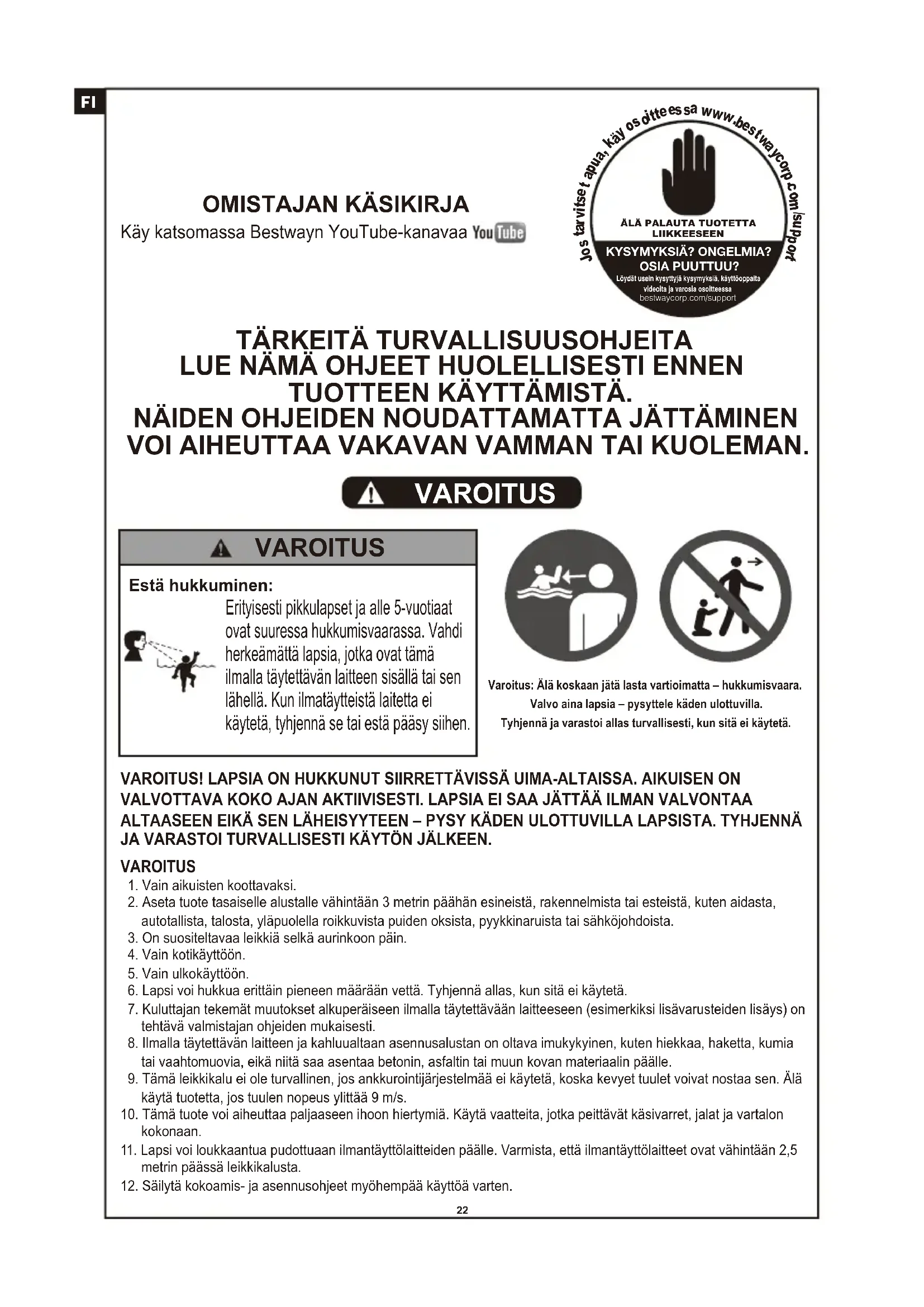 Estä hukkuminen: Erityisesti pikkulapset ja alle 5-vuotiaat ovat suuressa hukkumisvaarassa. Vahdi herkeämättä lapsia, jotka ovat tämä ilmalla täytettävän laitteen sisällä tai sen lähellä. Kun ilmatäytteistä laitetta ei käytetä, tyhjennä se tai estä pääsy siihen. VAROITUS VAROITUS! LAPSIA ON HUKKUNUT SIIRRETTÄVISSÄ UIMA-ALTAISSA. AIKUISEN ON VALVOTTAVA KOKO AJAN AKTIIVISESTI. LAPSIA EI SAA JÄTTÄÄ ILMAN VALVONTAA ALTAASEEN EIKÄ SEN LÄHEISYYTEEN – PYSY KÄDEN ULOTTUVILLA LAPSISTA. TYHJENNÄ JA VARASTOI TURVALLISESTI KÄYTÖN JÄLKEEN. VAROITUS