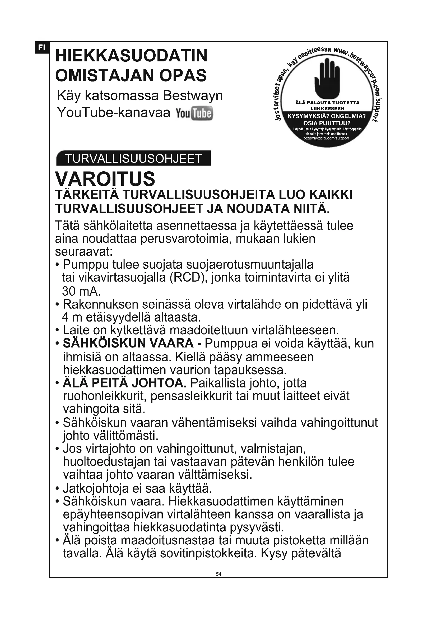 Käy katsomassa Bestwayn YouTube-kanavaa TURVALLISUUSOHJEETÄLÄ PALAUTA TUOTETTALIIKKEESEENKYSYMYKSIÄ? ONGELMIA?OSIA PUUTTUU? Löydät usein kysyttyjä kysymyksiä, käyttöoppaita videoita ja varosia osoitteessa bestwaycorp.com/support