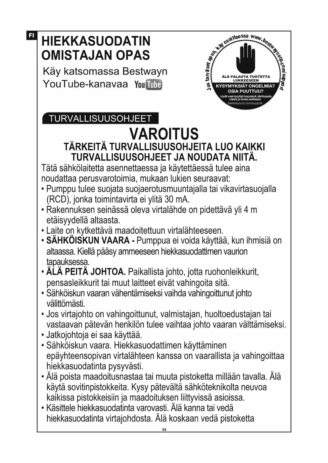 HIEKKASUODATIN OMISTAJAN OPAS TURVALLISUUSOHJEET Käy katsomassa Bestwayn YouTube-kanavaa ÄLÄ PALAUTA TUOTETTALIIKKEESEENKYSYMYKSIÄ? ONGELMIA?OSIA PUUTTUU?Löydät usein kysyttyjä kysymyksiä, käyttöoppaitavideoita ja varosia osoitteessa bestwaycorp.com/support